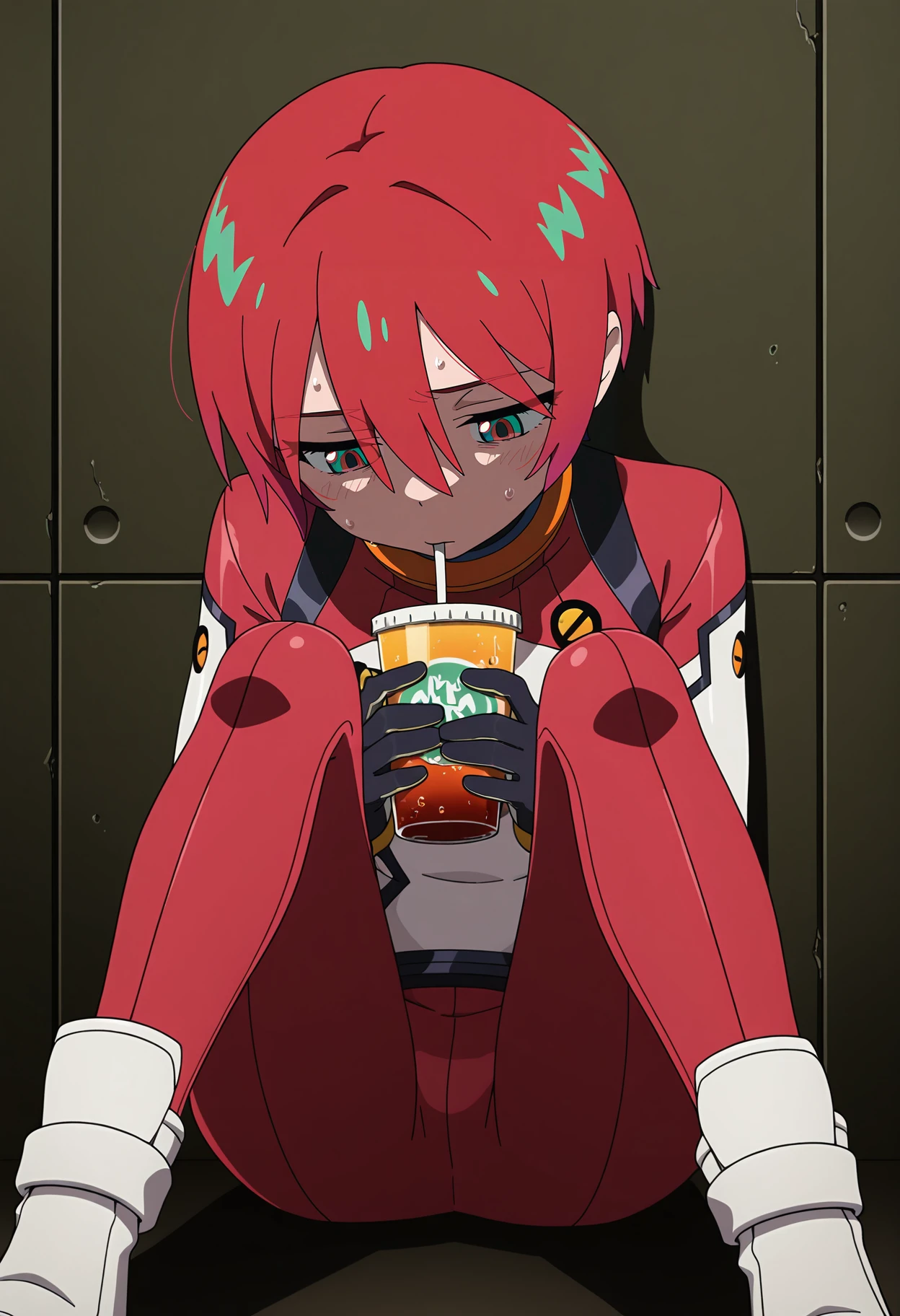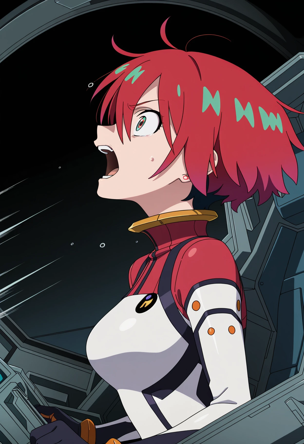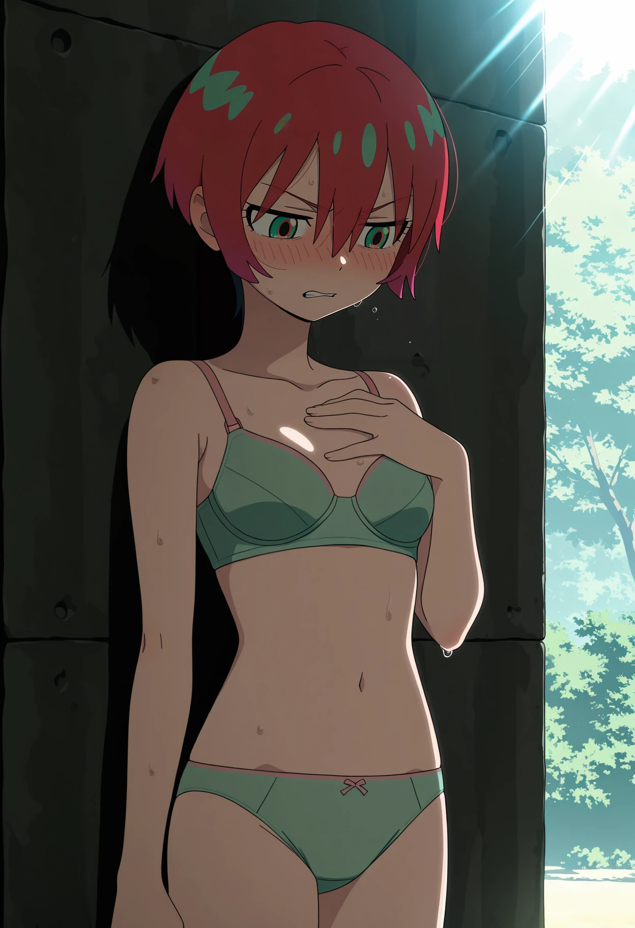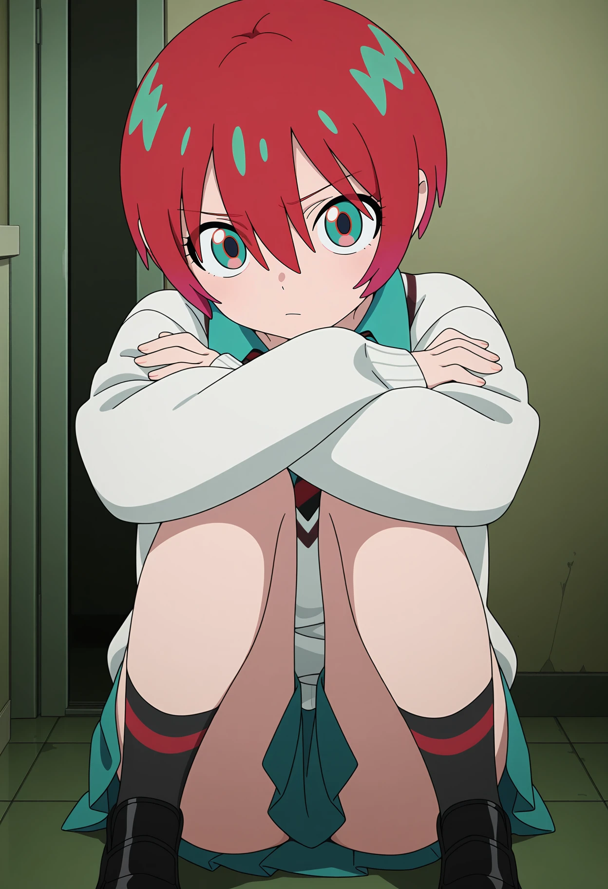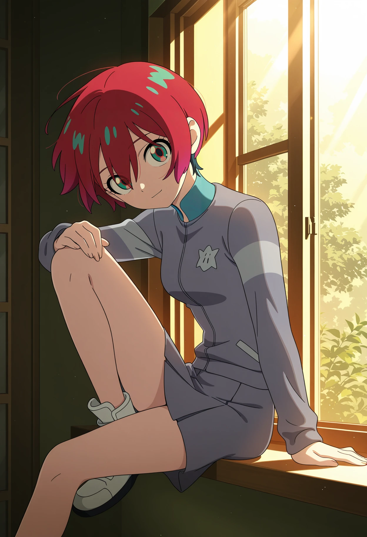 mm,red hair,short hair,hair between eyes,red and green eyes,anime coloring