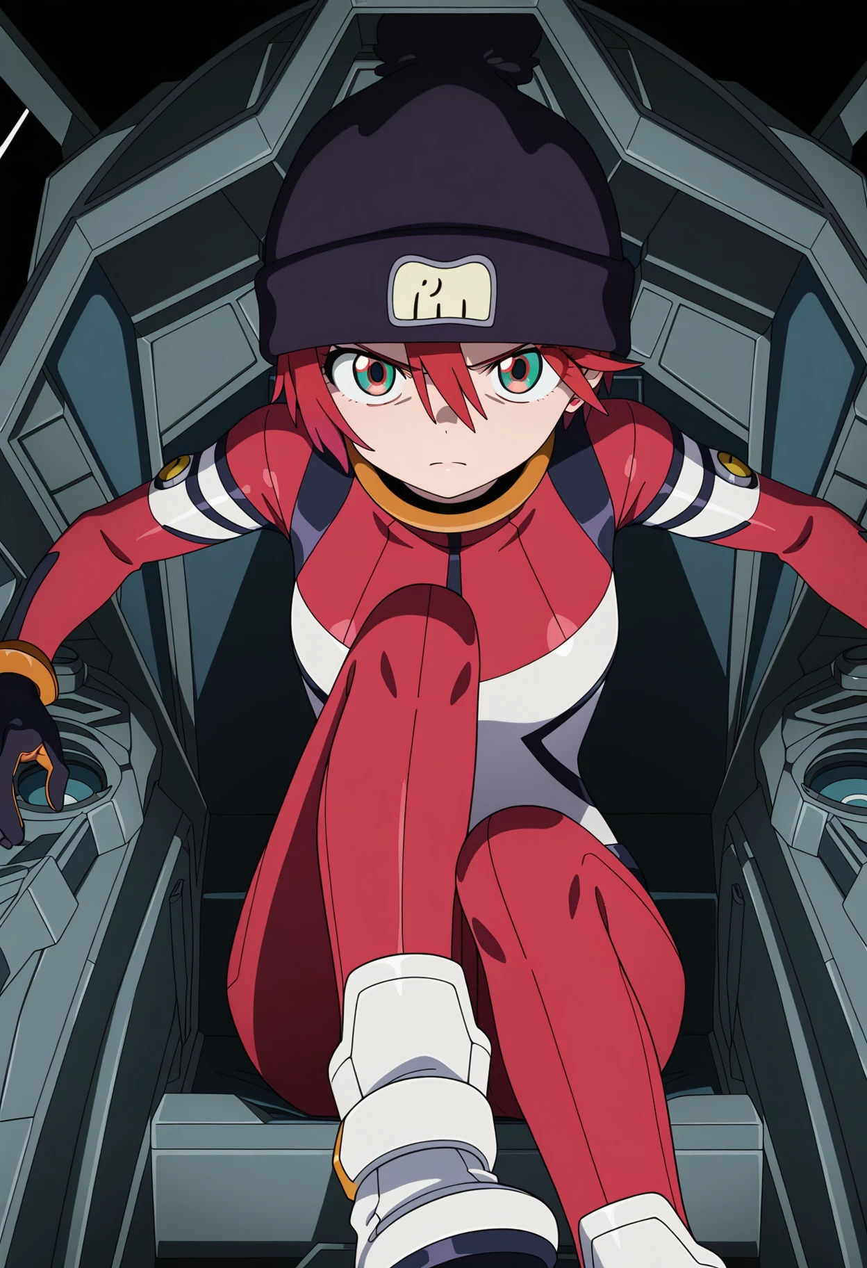 Red and white pilot suit,black beanie,black gloves,white footwear