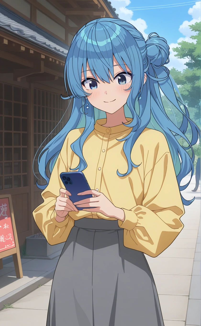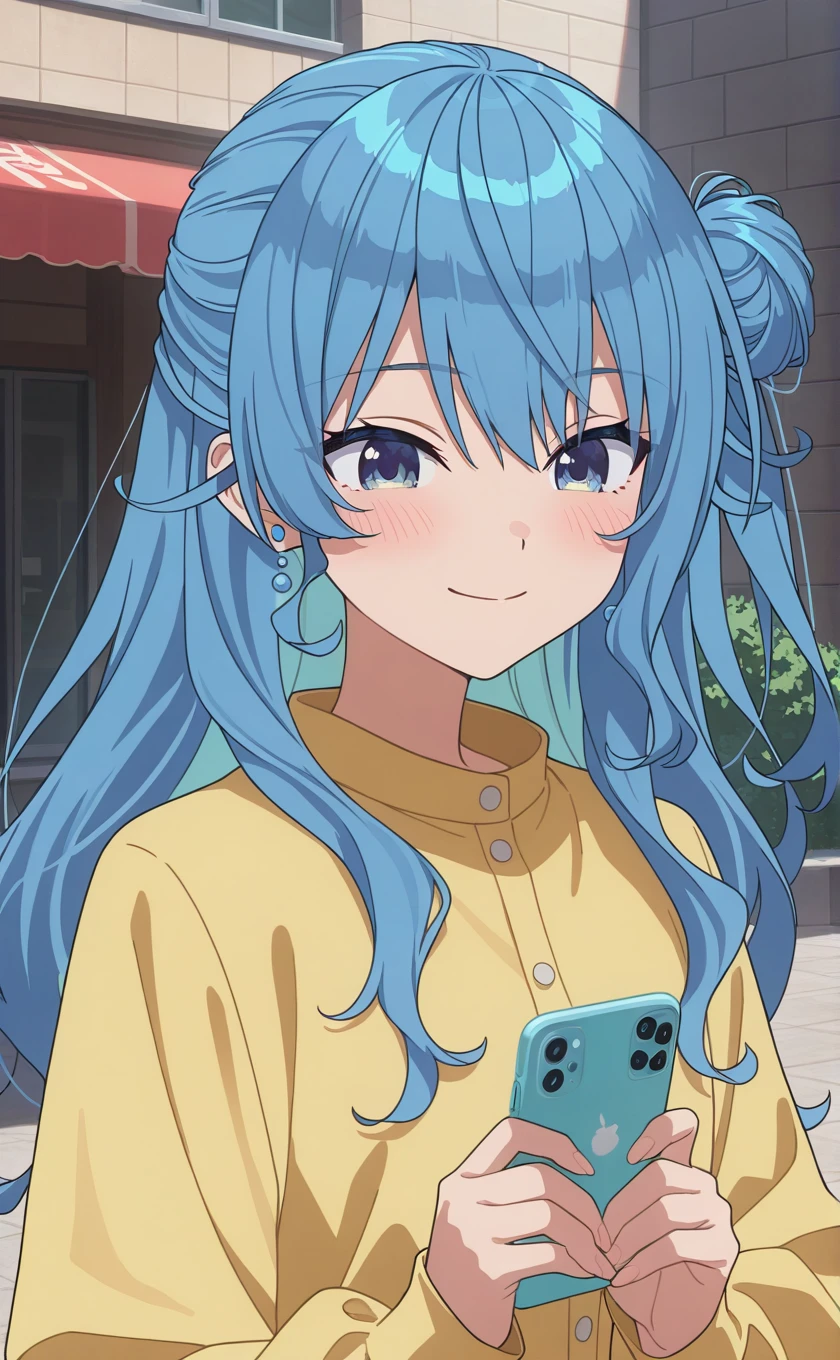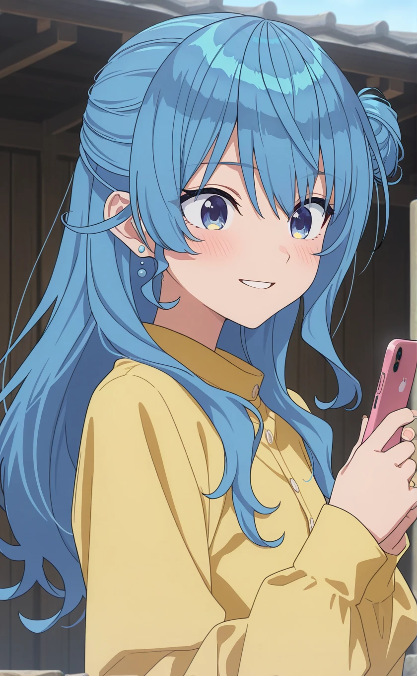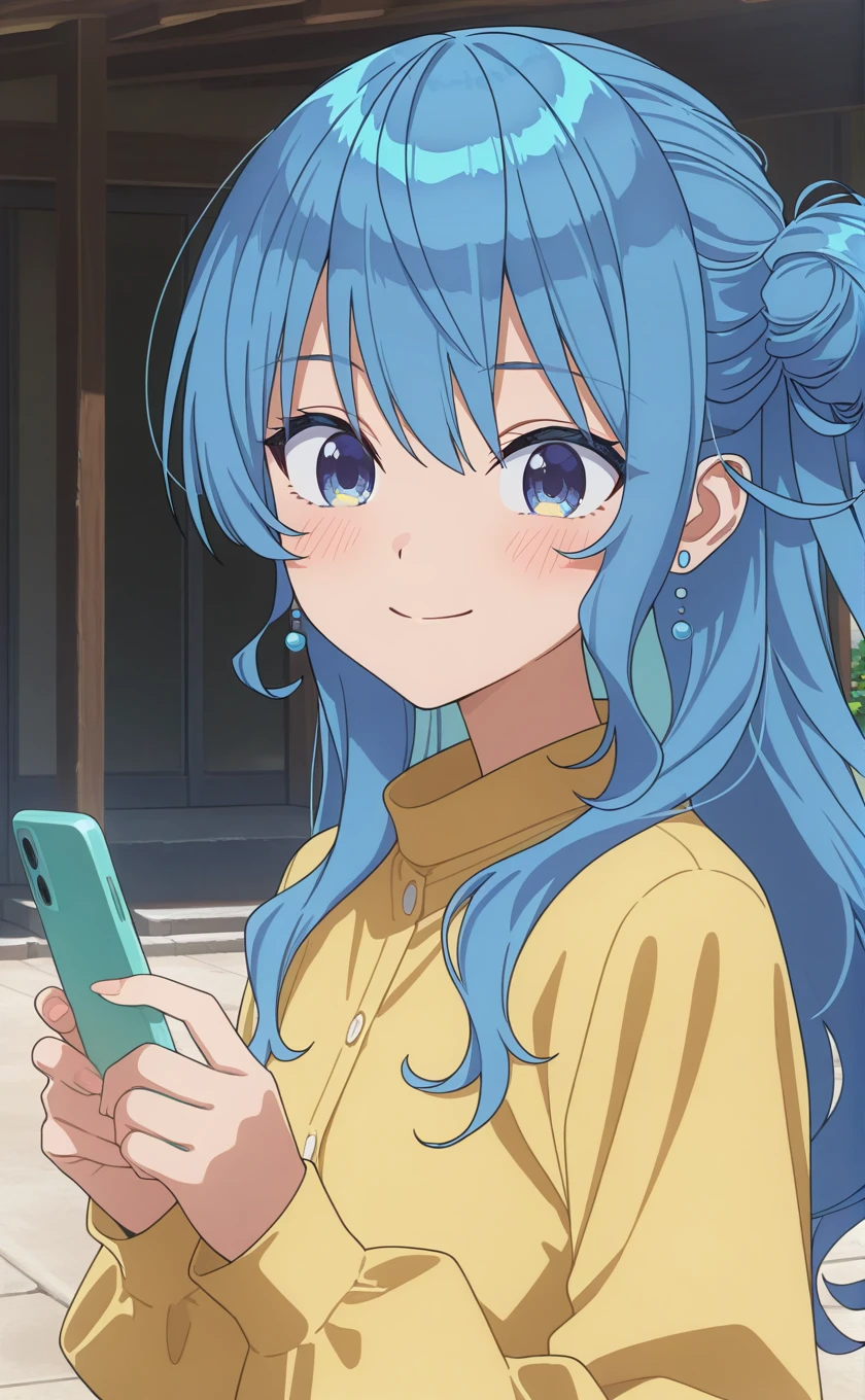 long hair,blue hair,single side bun,earrings,hair between eyes,blue eyes,symbol in eye