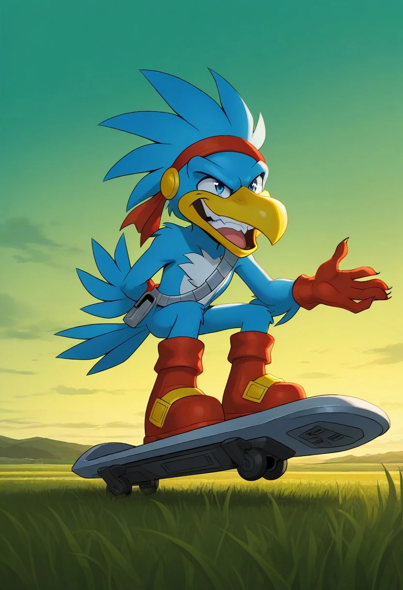 Predator Hawk, cyan fur, aqua blue eyes, yellow beak, cyan tail feathers, red headband, gray strap, red gloves, red boots