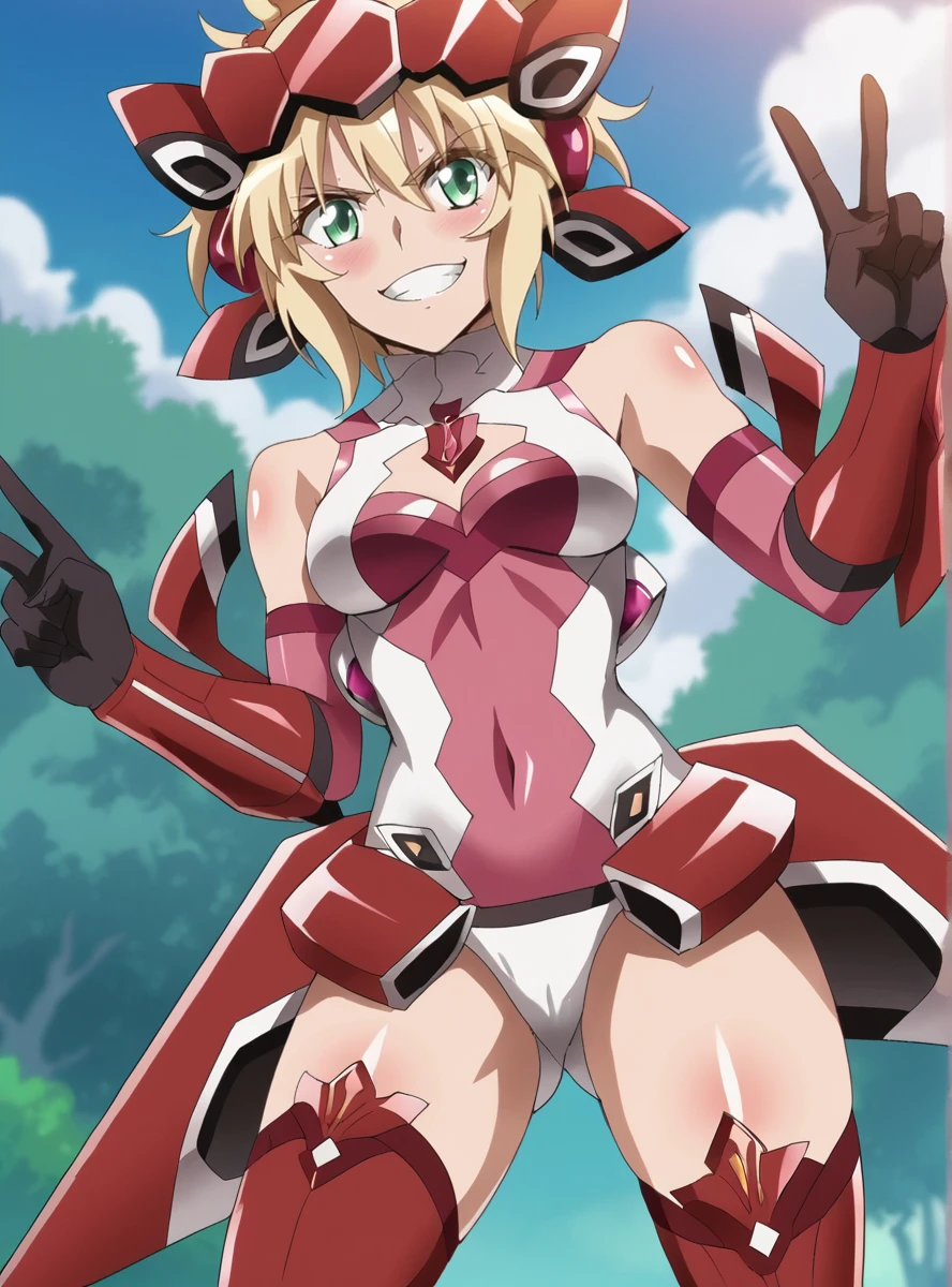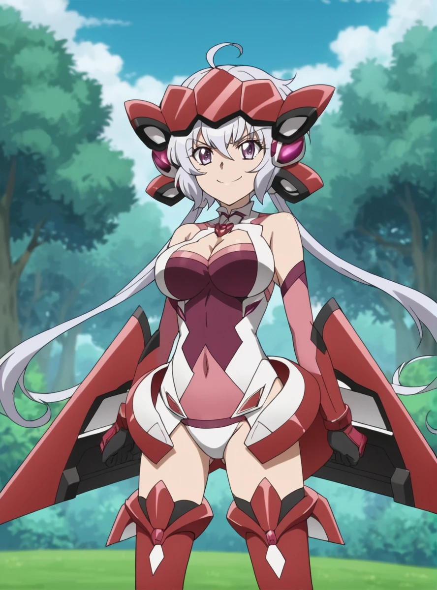 ICHIVAL SUIT: long hair, purple eyes, twintails, ahoge, large breasts, thighhighs, gloves, headgear, elbow gloves, leotard, covered navel