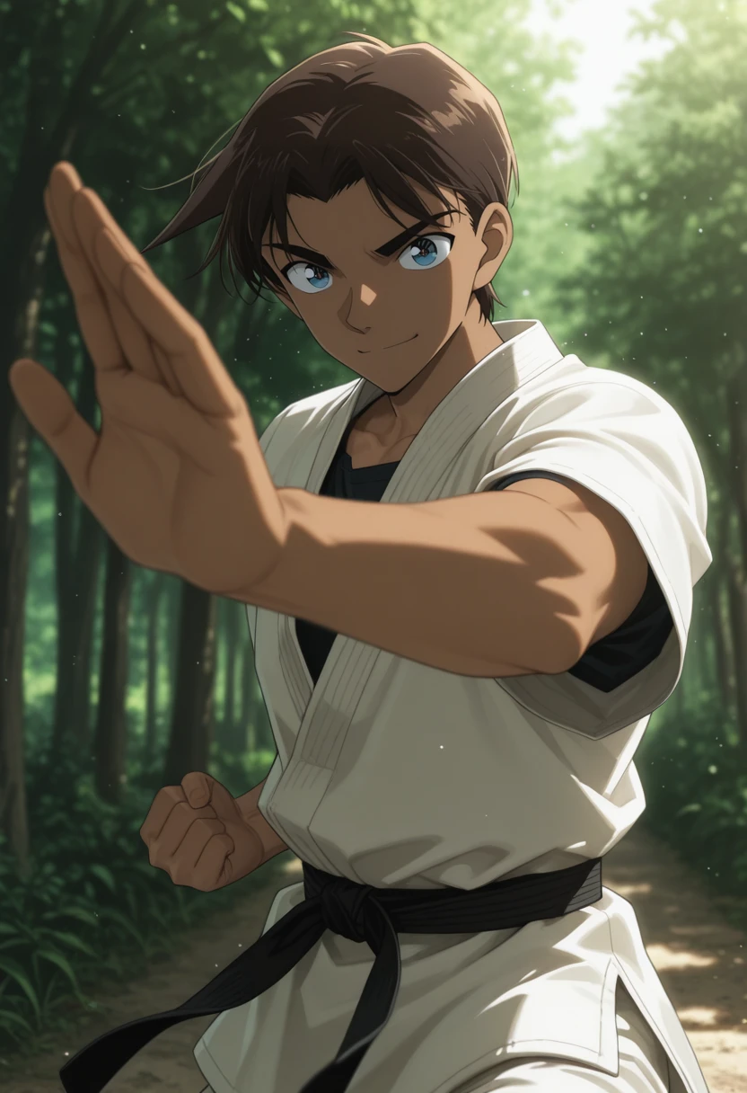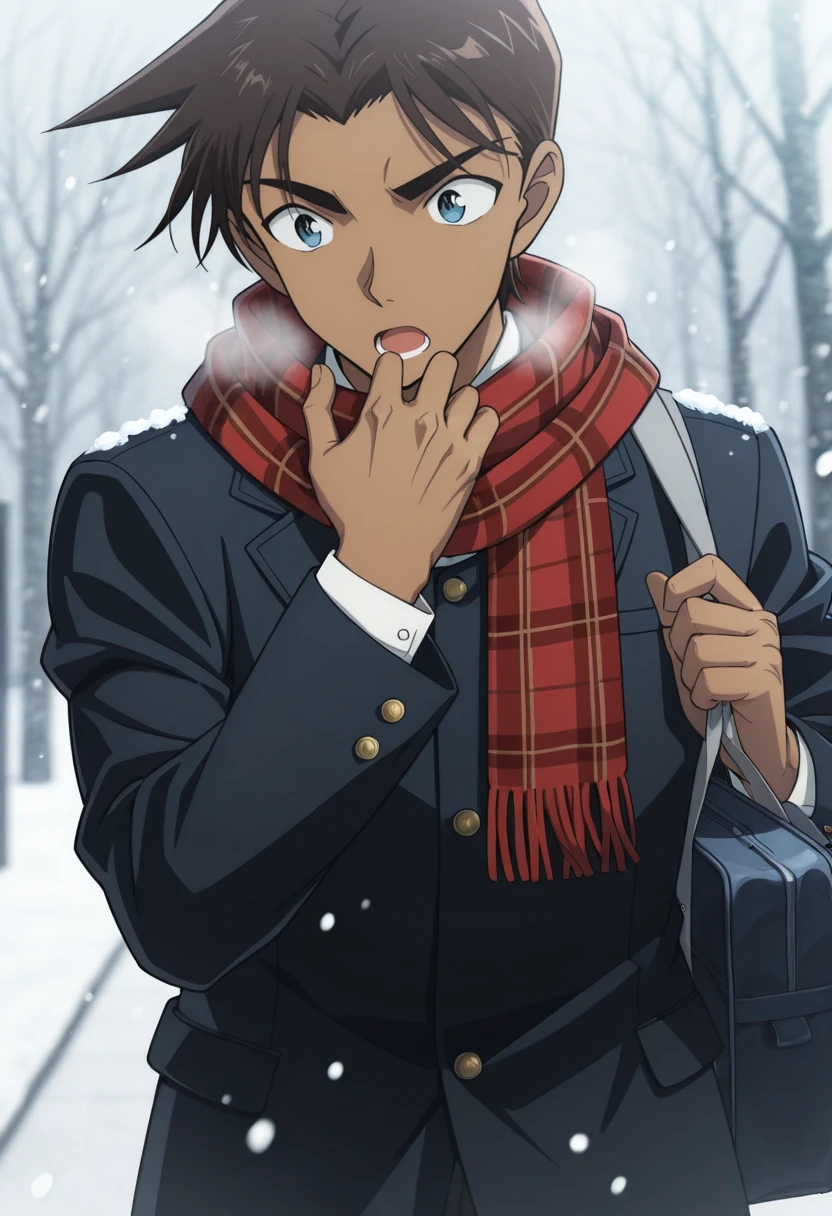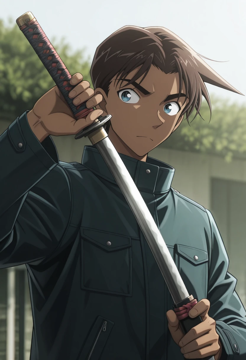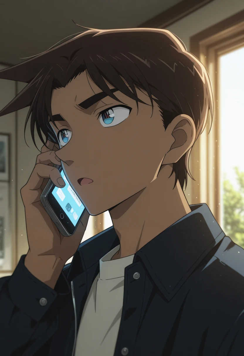 heiji,dark skin,dark-skinned male,blue eyes,brown hair,hat,baseball cap,jacket,brown jacket