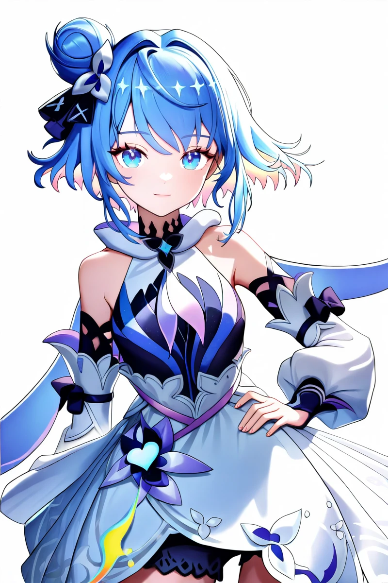 blue eyes,single hair bun,hair bun,detached sleeves,dress,short hair,white sleeves,colored inner hair,long sleeves,hair ornament,single side bun,puffy sleeves,blue hair,