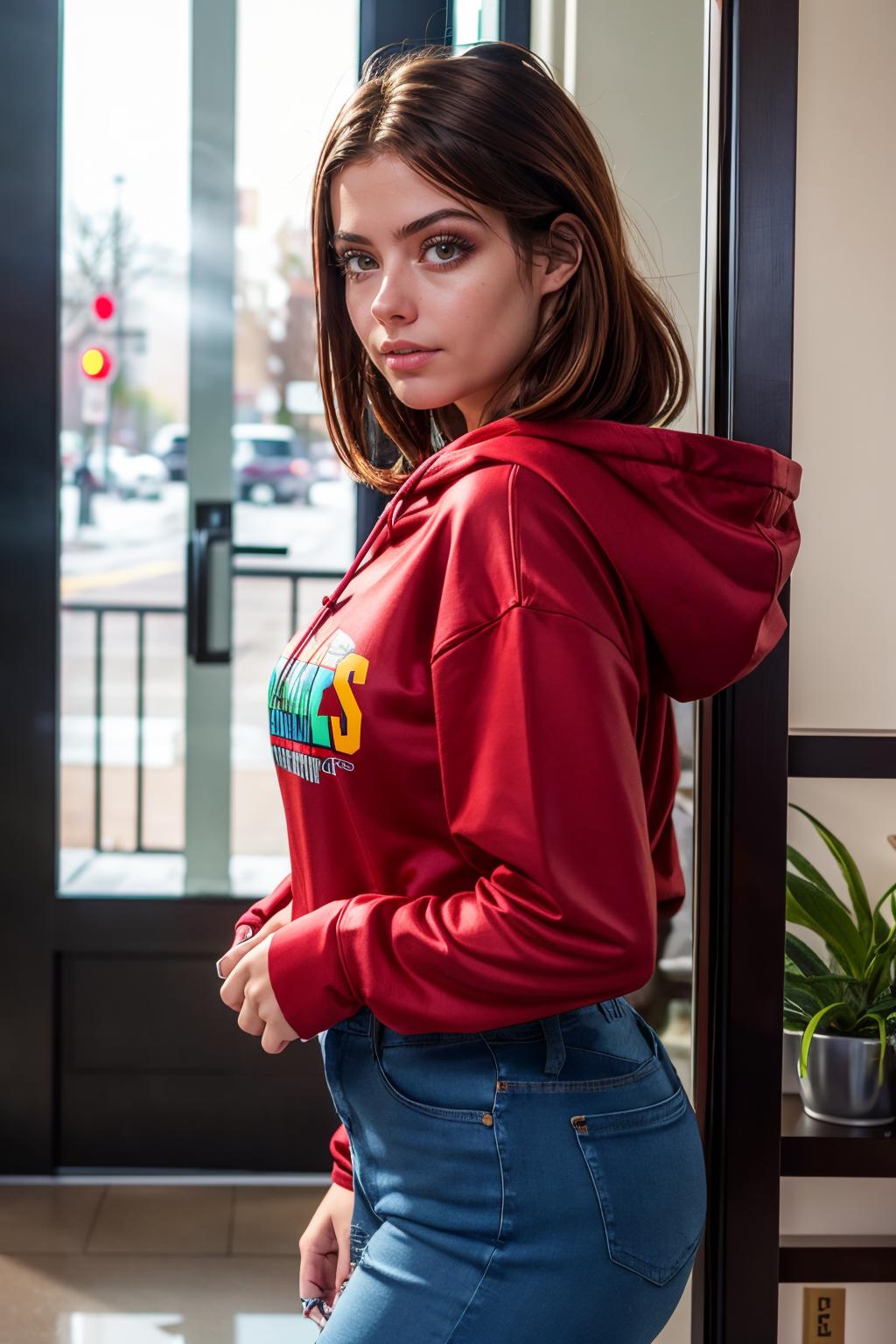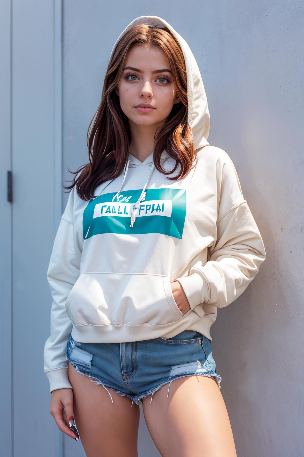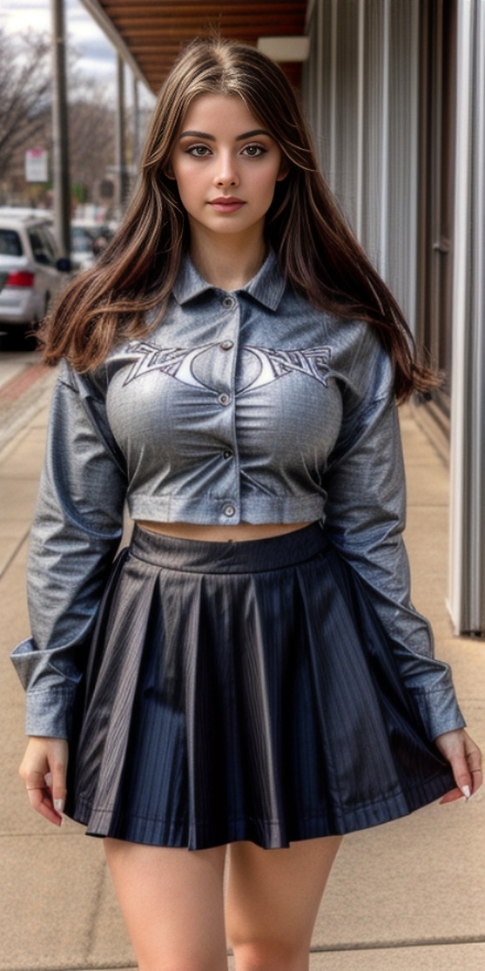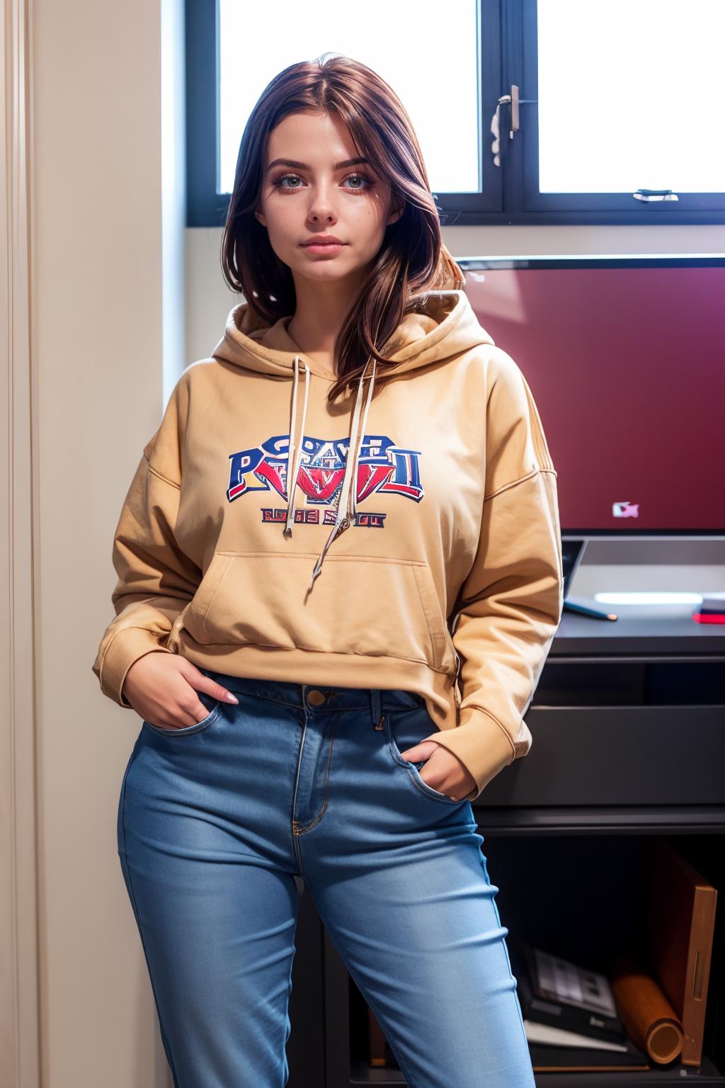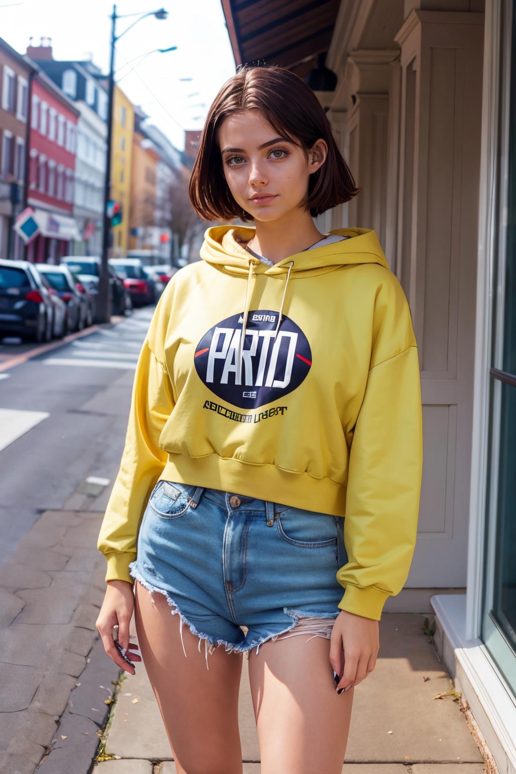 The pictures are a workaround for Civitai TOS. The pictures you get from the LoRa are usually much closer to what she usually wears.