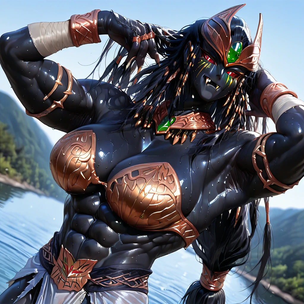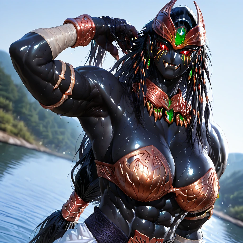 Mebio, black skin, red eyes, red iris, red pupils, glowing eyes, six pack, big breasts, jewels, braided hair, long hair, green jewel, golden crown, bare shoulders, hourglass body,