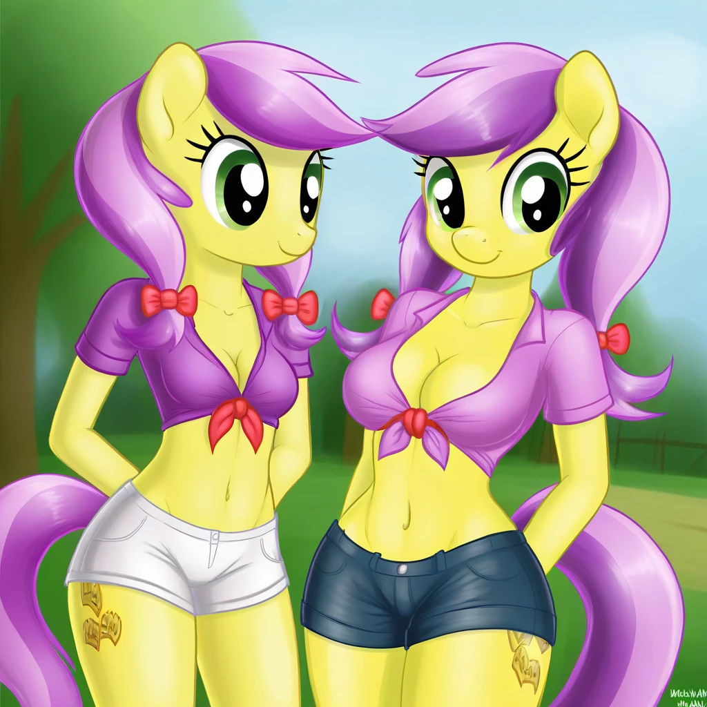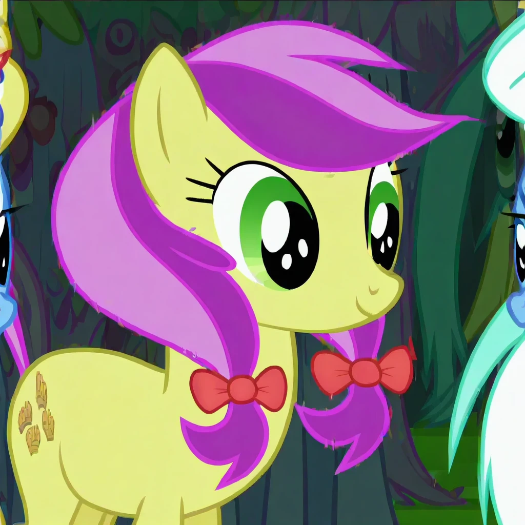 Lavender Fritter_(Mlp), Pony, Twintails, Low Twintails, Purple Hair, Red Bow, Green Eyes, Yellow Body