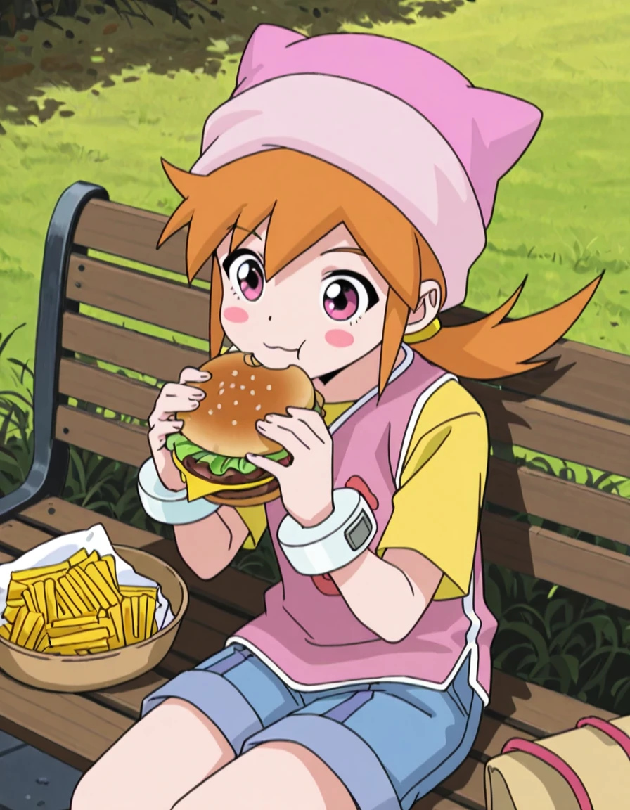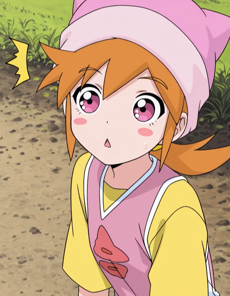 Trained prompts: shionchan, hibikiShion, orange hair, ponytail, pink eyes, blush stickers, pink hat, pink shirt, yellow sleeves, shorts