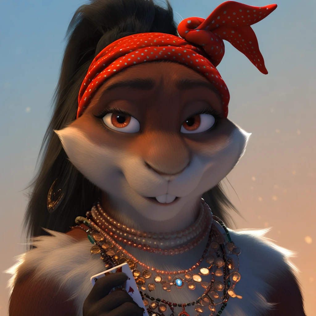 MaM1_IL, solo, anthro, female, black ears, brown body, brown hair, white shoulder tuft, white neck, white face, cheek tuft, two tone body, white countershading, white eyelashes, buckteeth, animal nose, brown nose, rabbit, ears tied back, red kerchief, polka dot headwear, jewelry, necklace, bracelet, loincloth, 5 fingers, nub tail, multicolored bottomwear