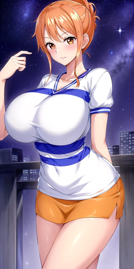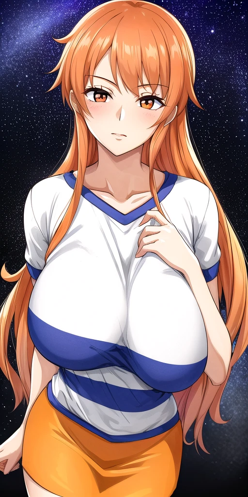 White_striped_shirt_Orange_pencil_skirt_short_sleeves: Her OG attire wich should go with OGN4mi_short_hair.
