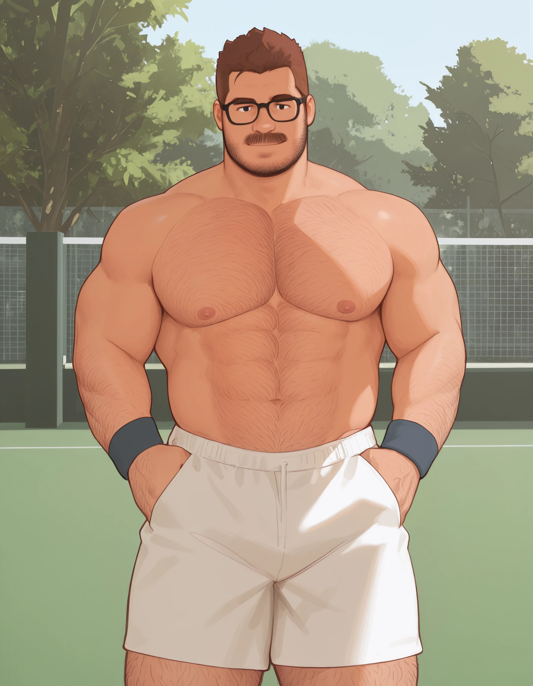 大黑:0s1j10, brown mustache, brown beard, brown hair, black-framed eyewear, black eyes,spiked hair