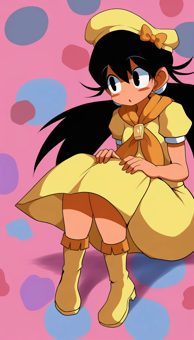 peppina \(pizza tower\),1girl,solo,black hair,thighhighs,hat,black eyes,long hair,twintails,black thighhighs,smile,genderswap,full body,dark-skinned female,genderswap (mtf),dark skin,apron,short sleeves,zettai ryouiki,standing,skirt,low twintails,white headwear,dress,neckerchief,