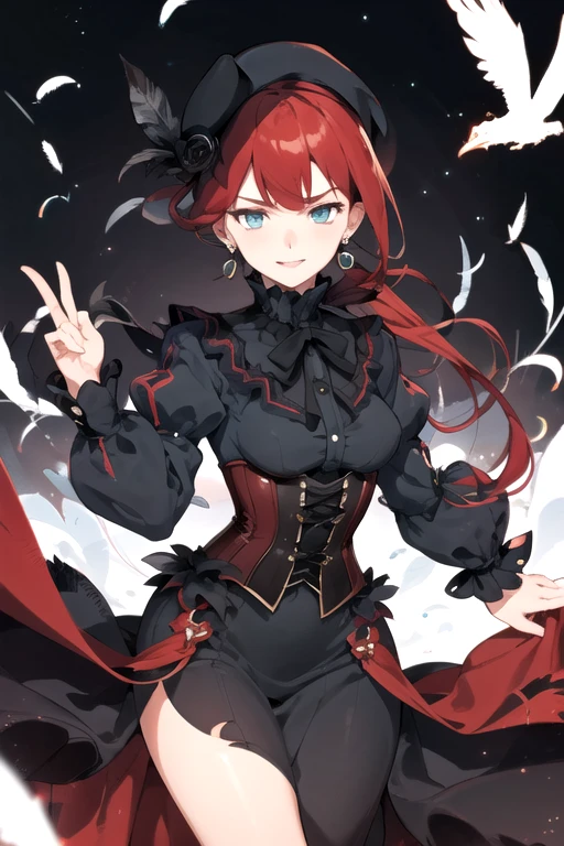 TurduckenFF, 1girl, solo, long hair, long sleeves, black dress, jewelry, red hair, earrings, low ponytail, puffy sleeves, black headwear, black bow, beret, feathers, tilted headwear, corset