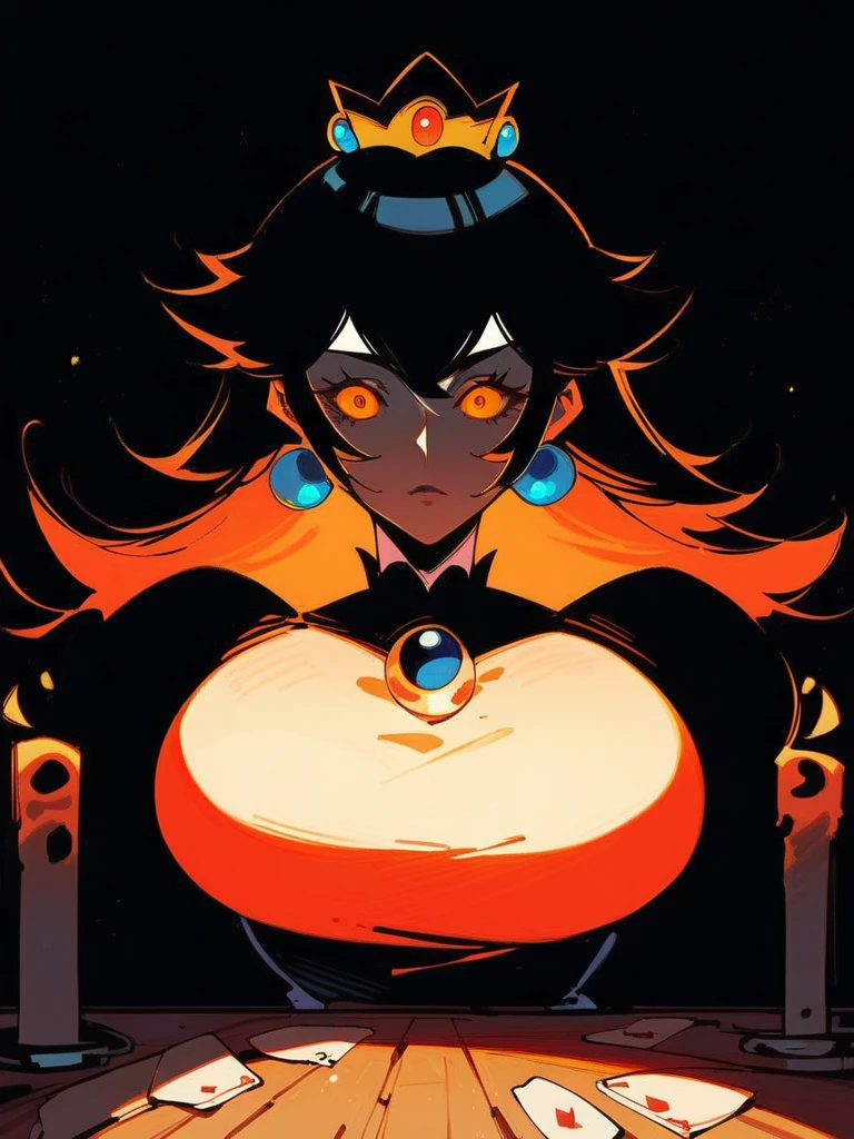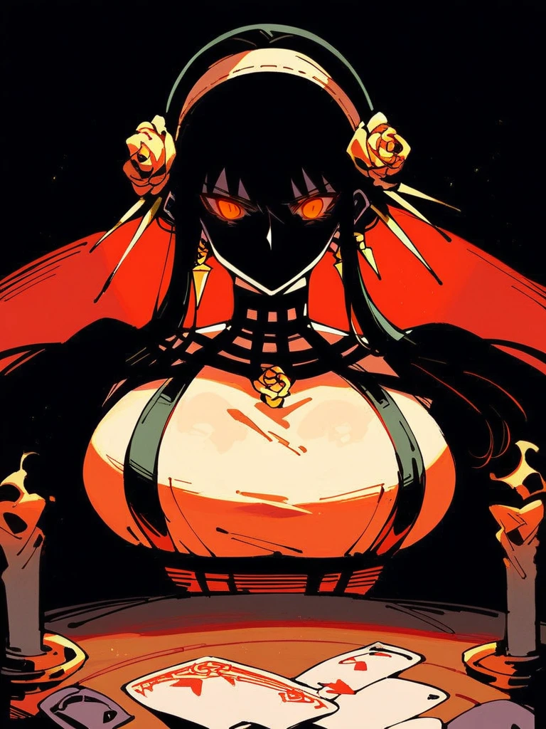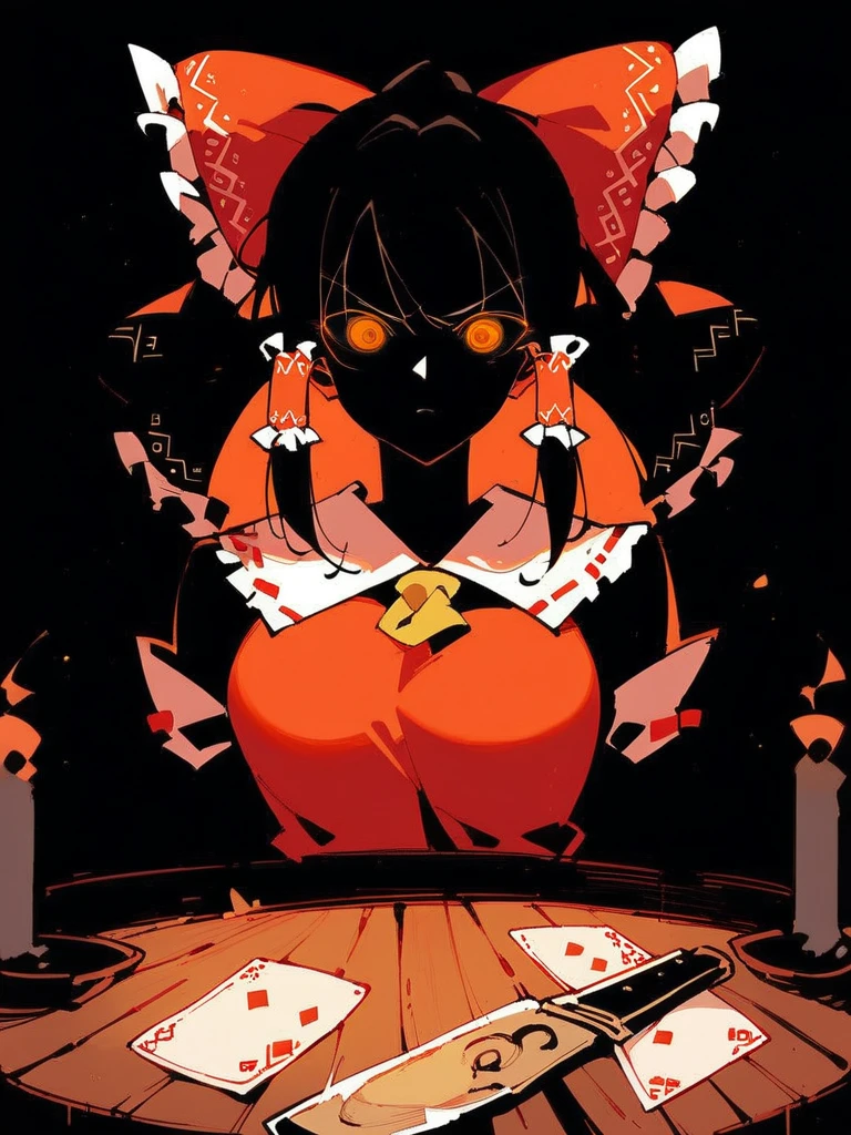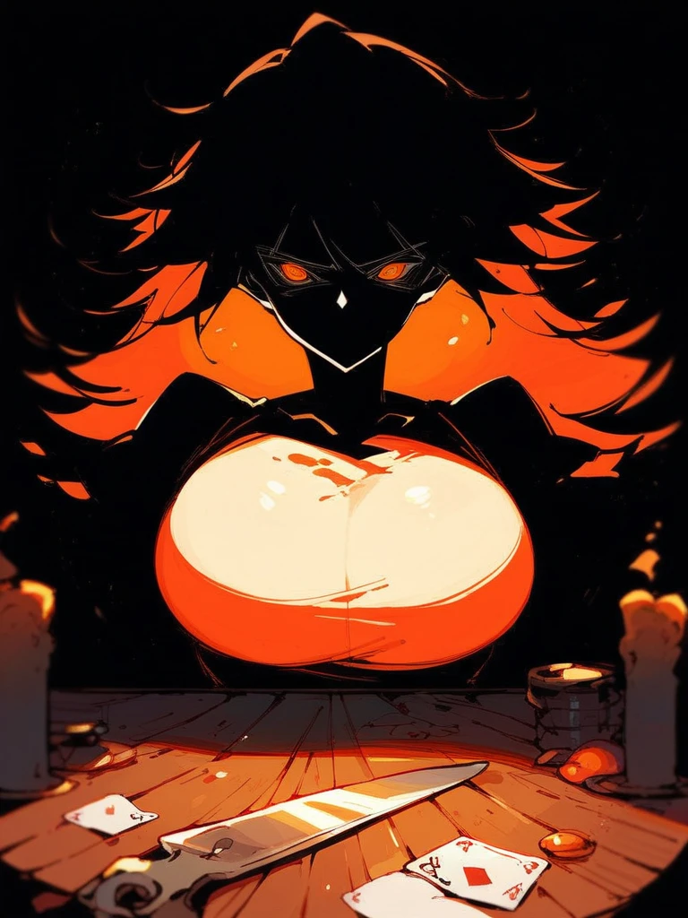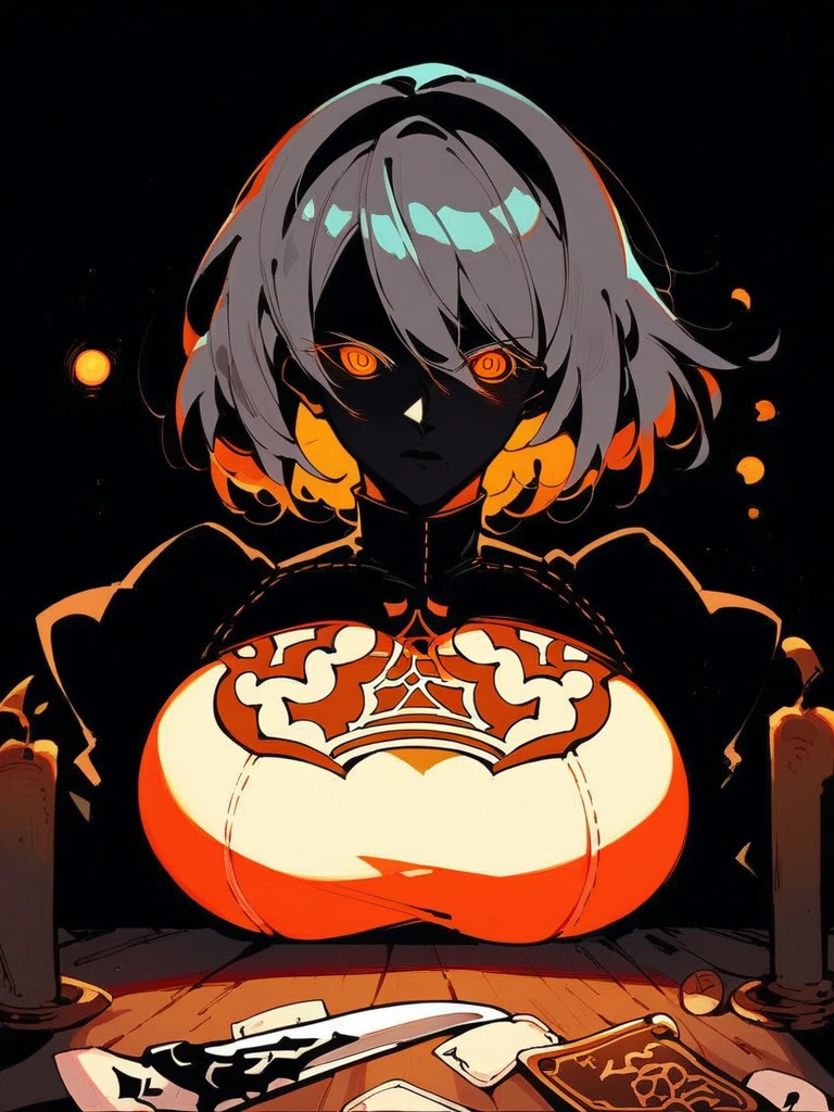 Support tags: glowing eyes,shaded face,(black face:1.2),table
