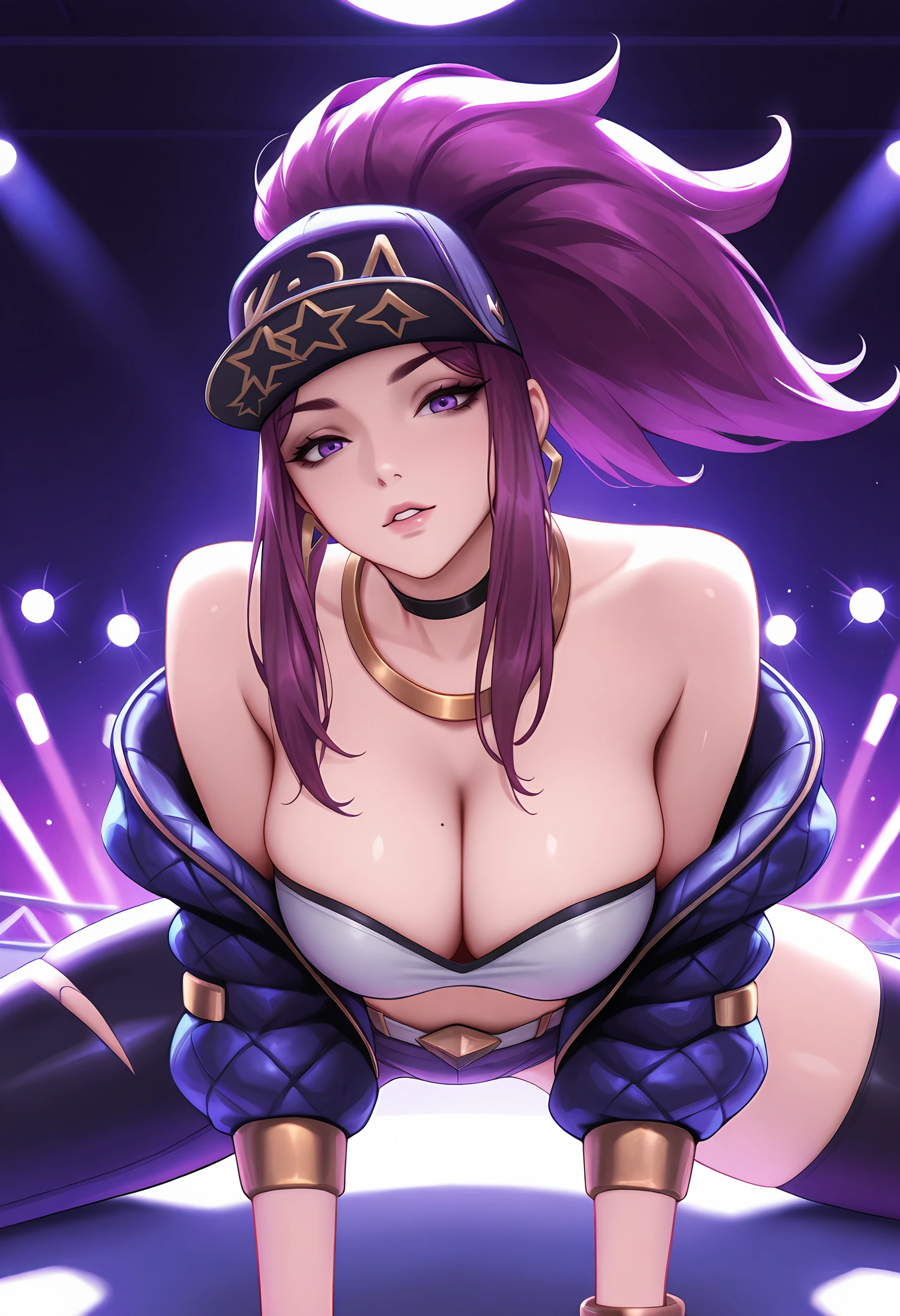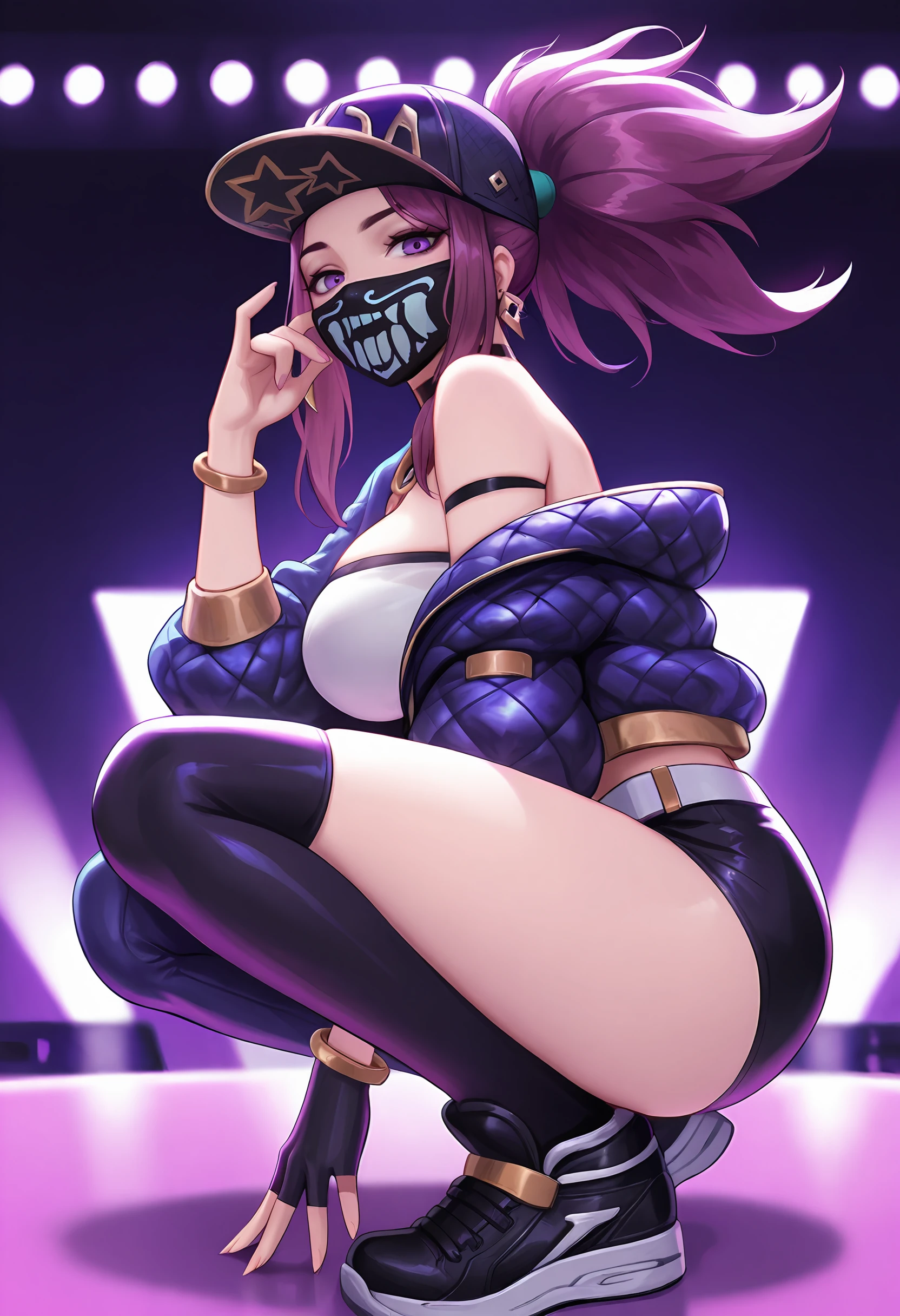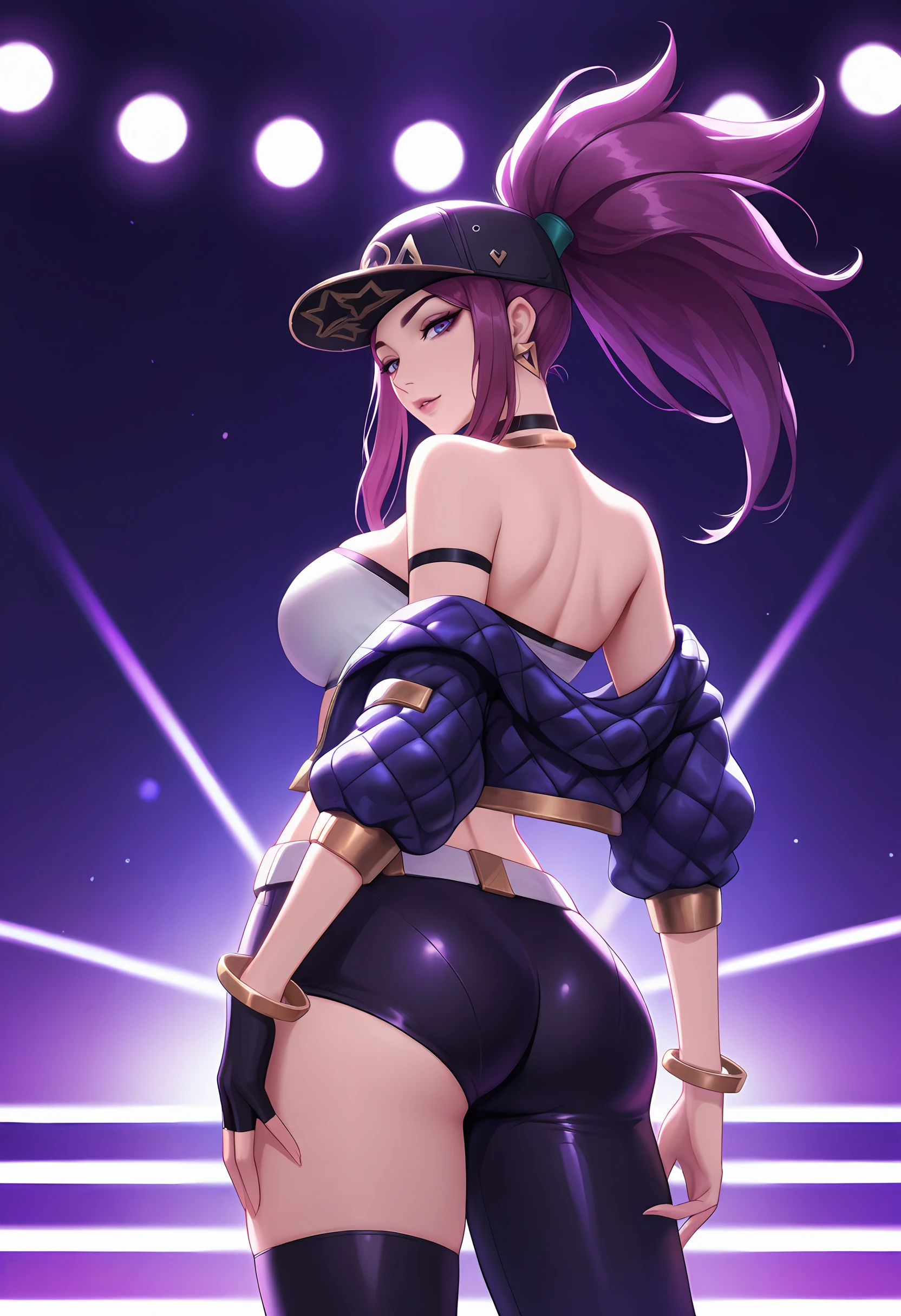 akalikda, long hair, baseball cap, k/da (league of legends), purple hair, single fingerless glove, ponytail, bandeau, choker, bracelet, necklace, earrings, asymmetrical legwear, single pantsleg, open jacket, belt,