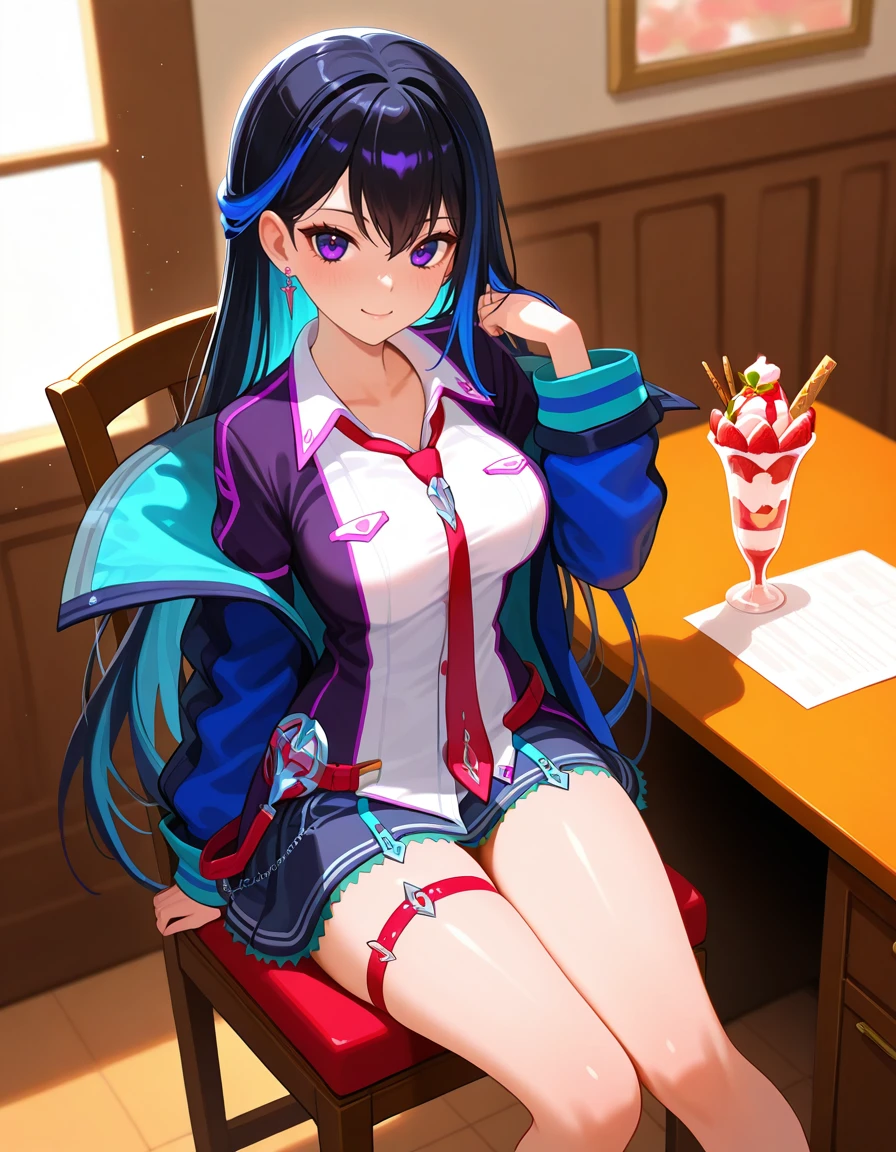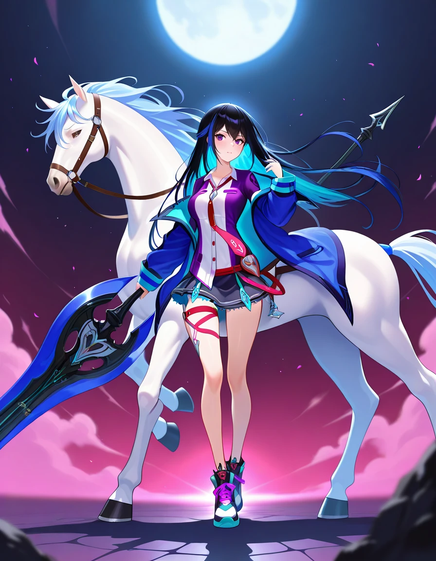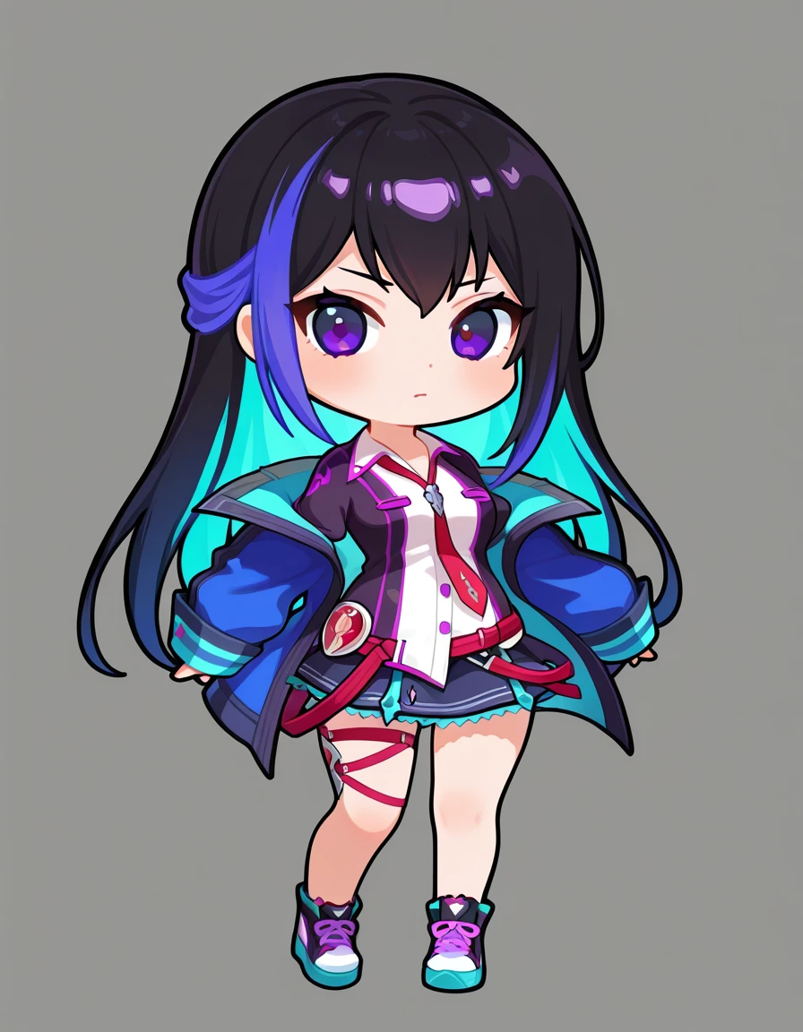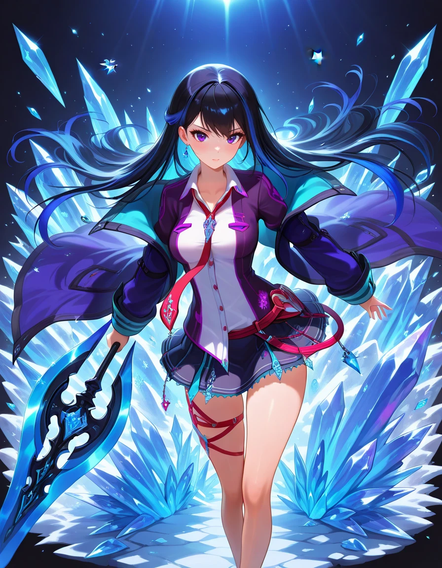 PokForcas, 1girl, purple eyes, long hair,two-tone hair,blue hair,dress shirt, red necktie,open jacket,miniskirt,thigh strap,sneakers,