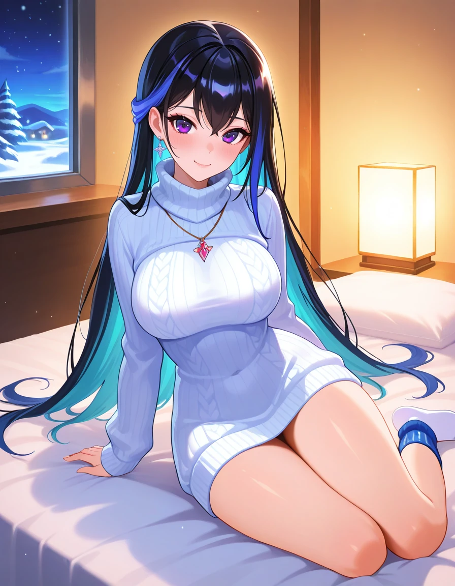 Christmas outfit: 1girl, purple eyes, long hair,two-tone hair,blue hair, hair ornament,turtleneck, necklace,sweater dress, socks,