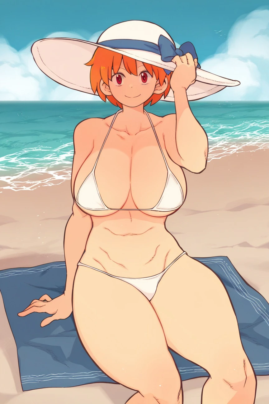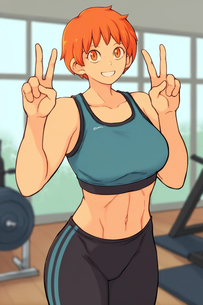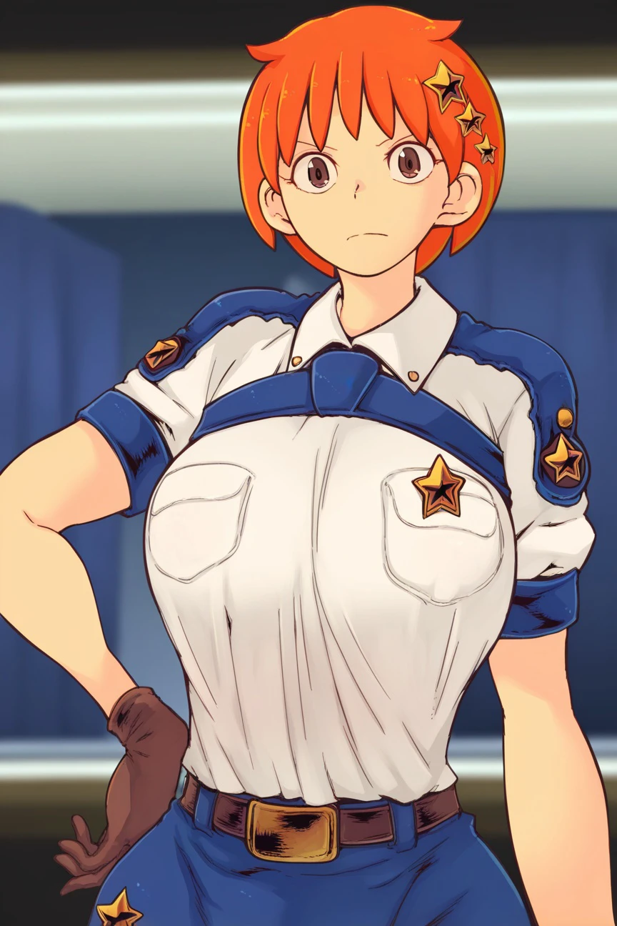 copkk, short hair, orange hair, star hair ornament, policewoman, white shirt OR shrug (clothing) & torn clothes, blue skirt, miniskirt, blue necktie, brown gloves, sheath, katana, handgun