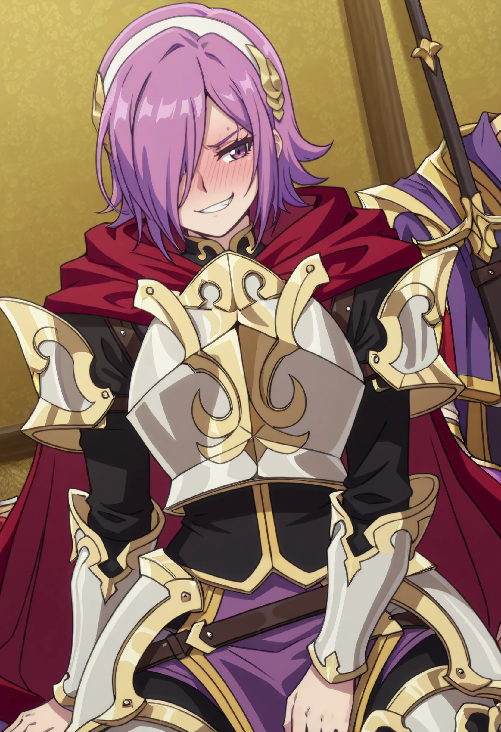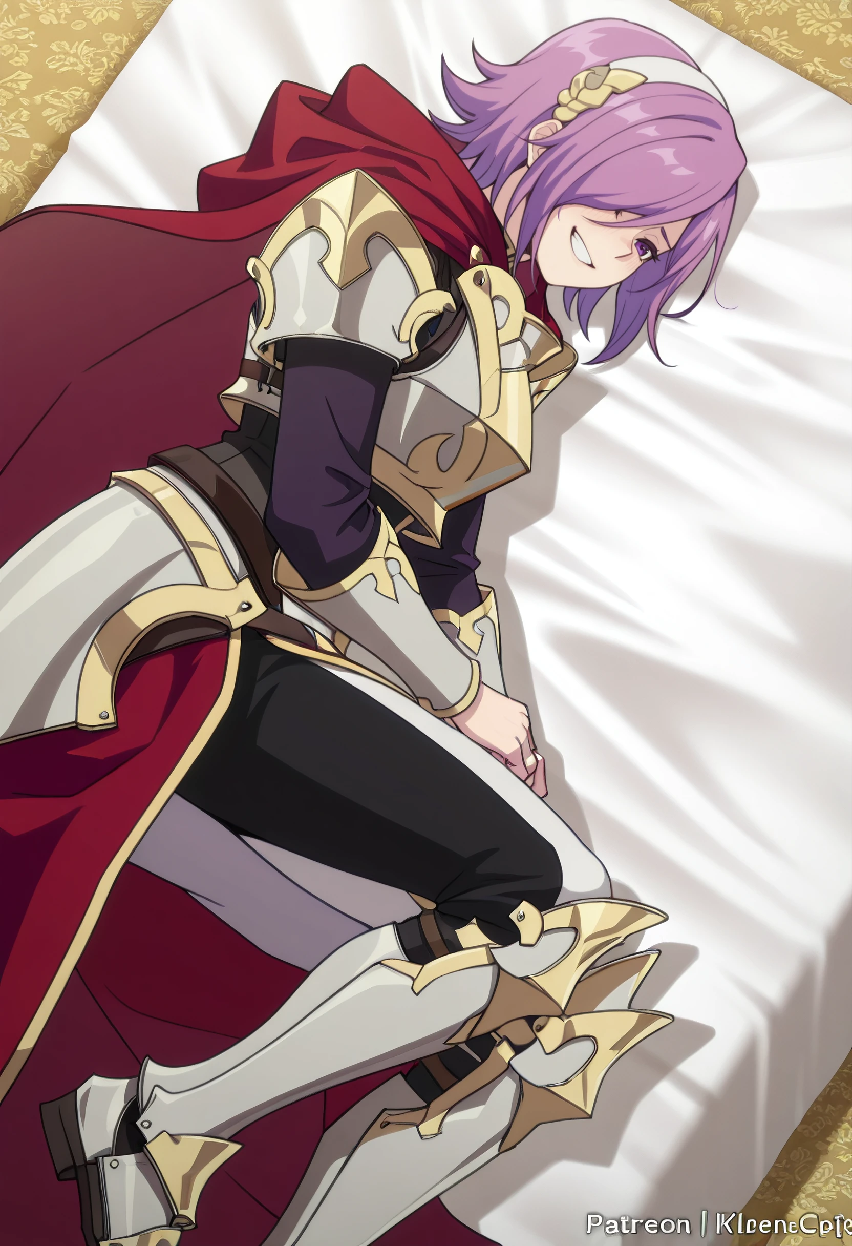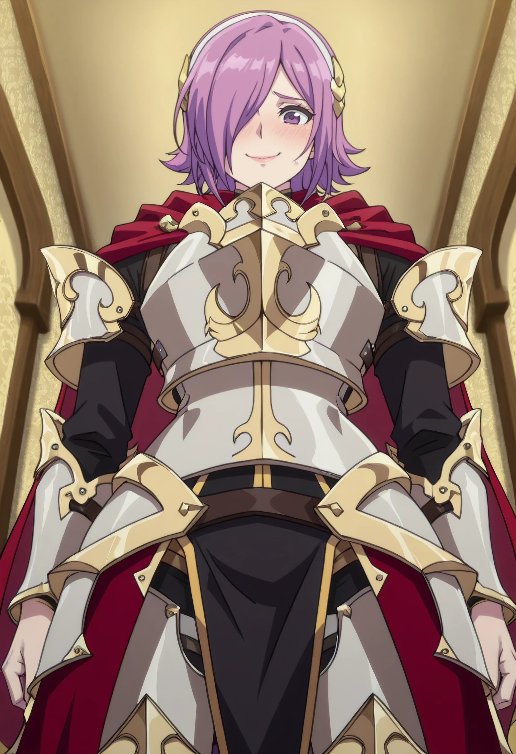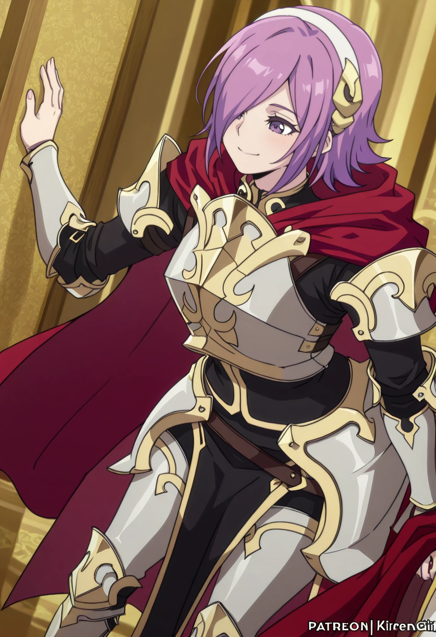 KilrenOutfit, armor, cape, breastplate, hairband, shoulder armor, red cape, armored boots, greaves, robe, purple eyes, hair ornament, boobplate, white hairband,