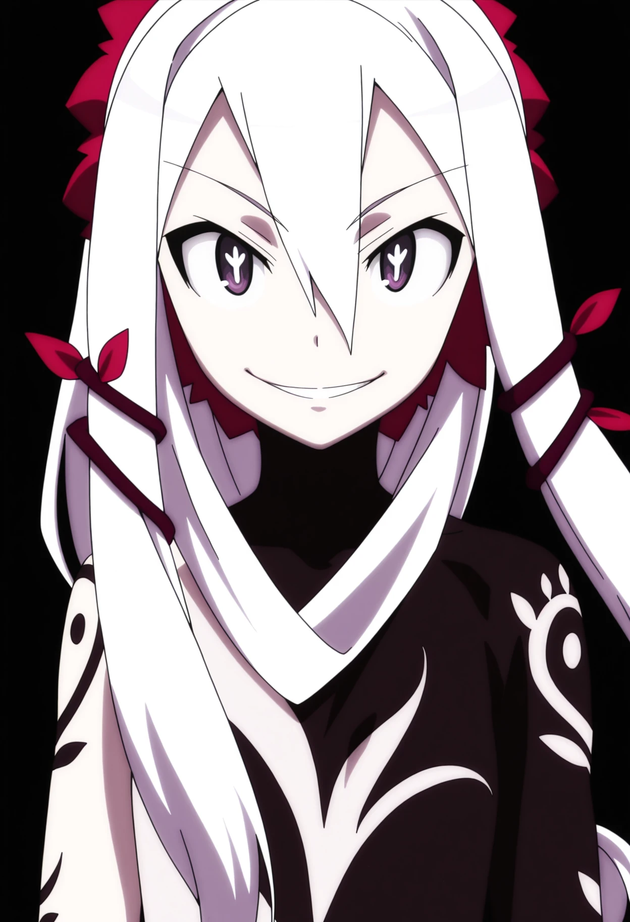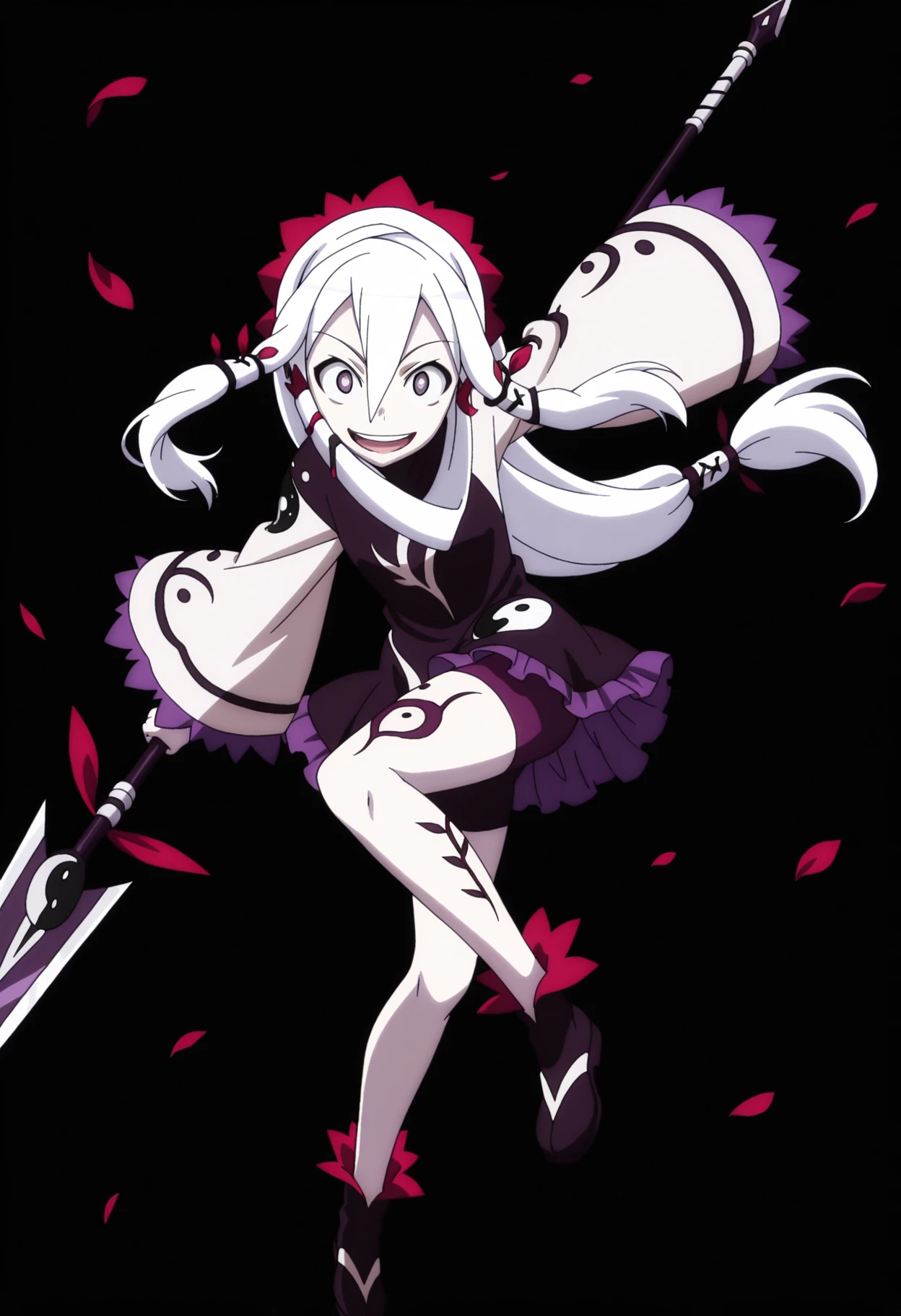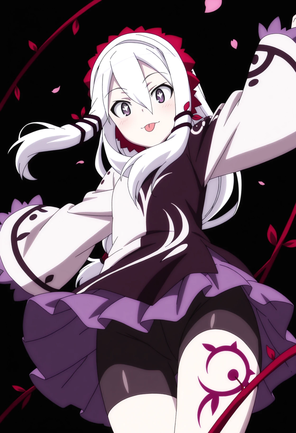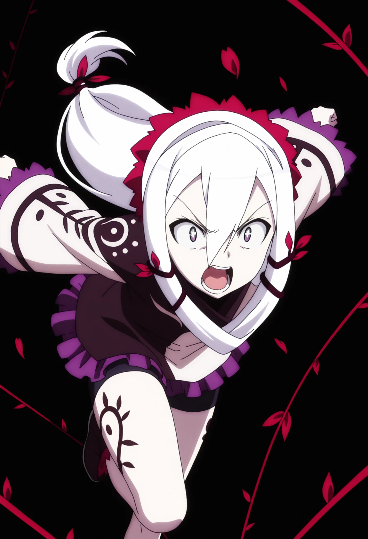 1girl, solo, mistleteinn, long hair, low-tied long hair, white hair, hair between eyes, symbol-shaped pupils, hair ornament, purple eyes, grey eyes, pale skin, sidelocks, petals, hair tubes, vines, thorns, plant, tattoo, leg tattoo
