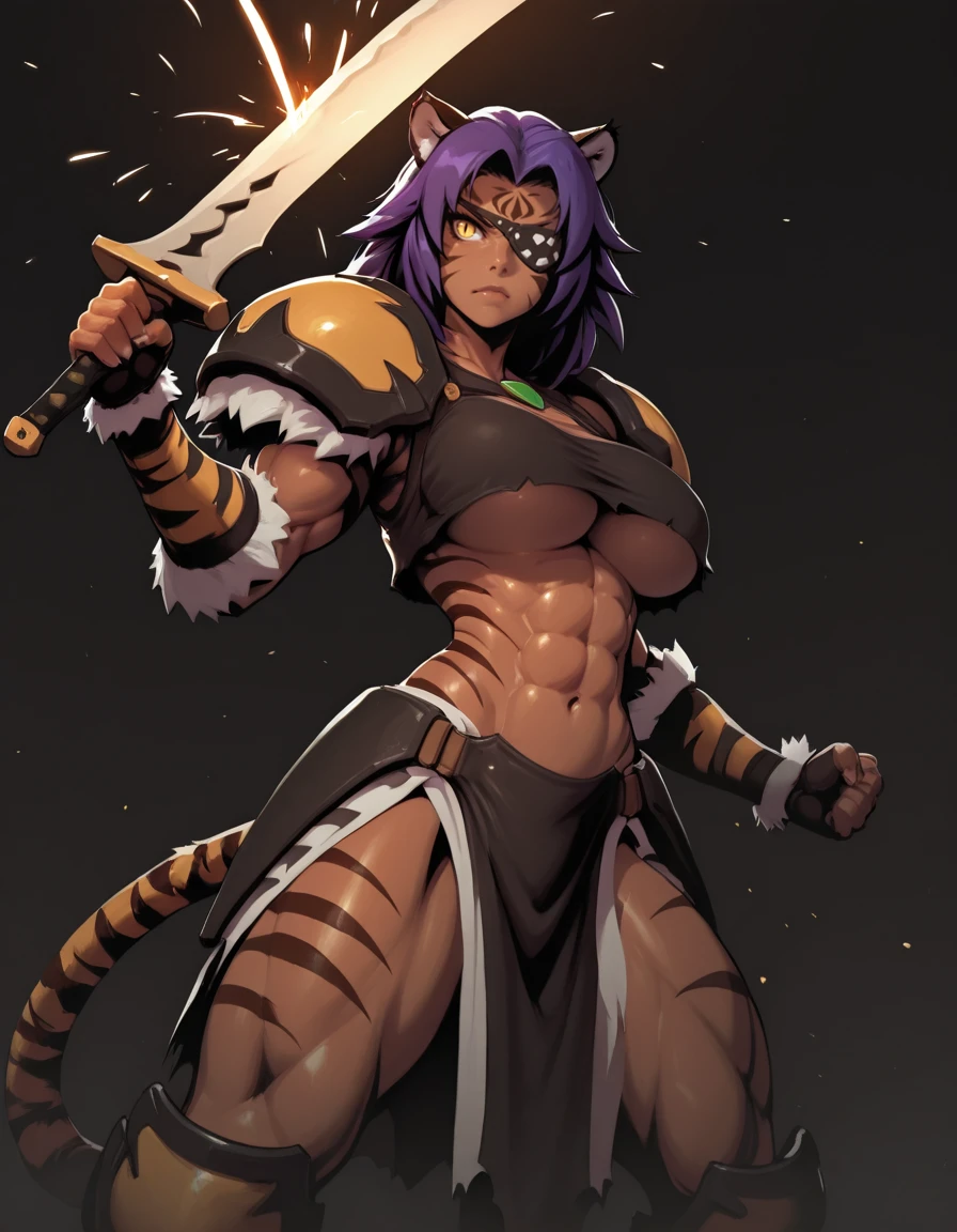 dark-skinned female, yellow eyes, slit pupils, muscular, tail, pelvic curtain, crop top, shoulder armor, tiger girl, underboob, eyepatch