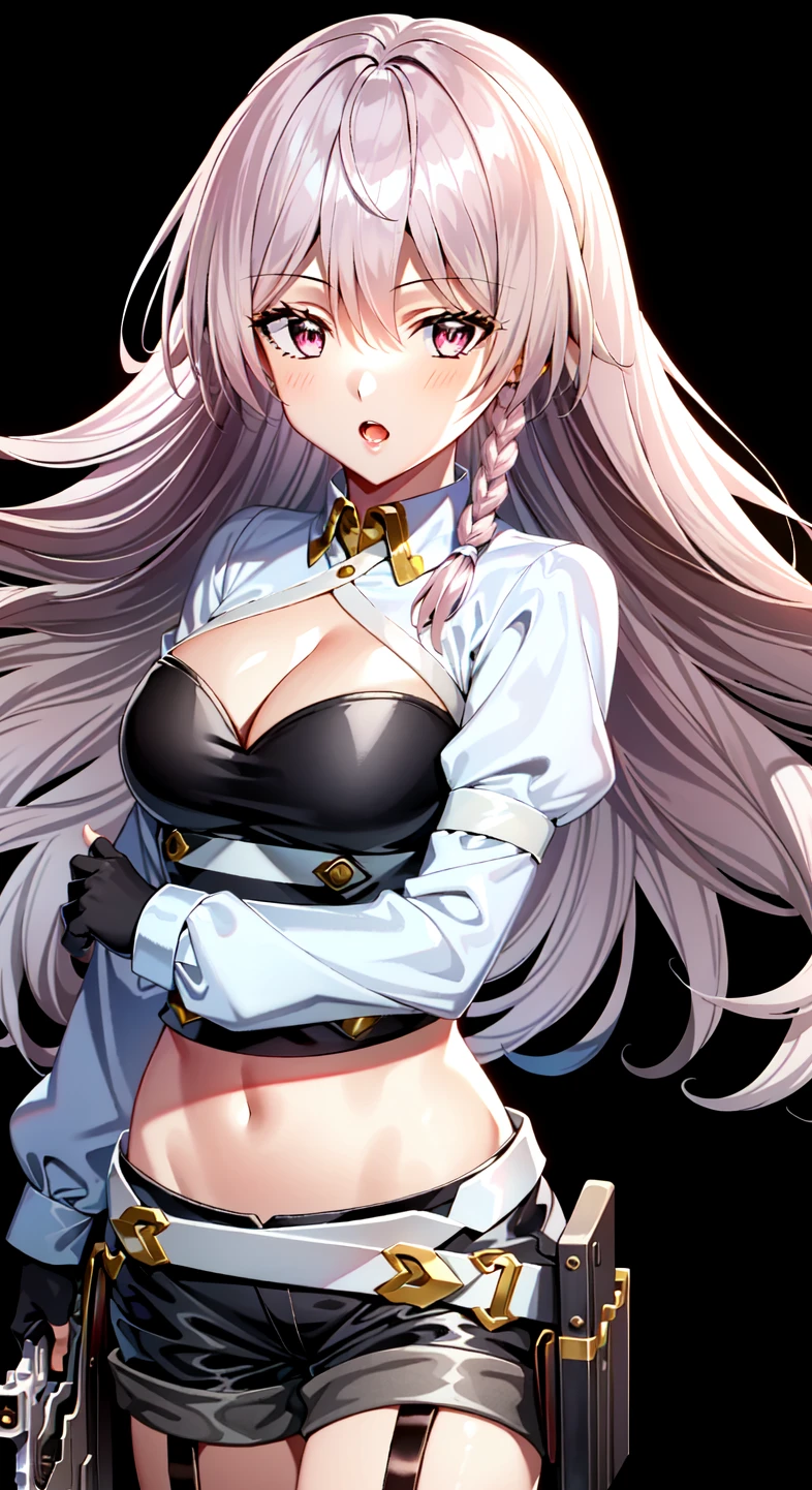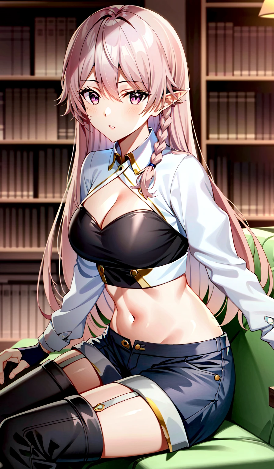 Luna Heela, 1girl, solo, fingerless gloves, long hair, thighhighs, pointy ears, gloves, breasts, braid, shorts, navel, cleavage, pink hair, black gloves, midriff, thigh boots, medium breasts, elf, couch, boots, crop top