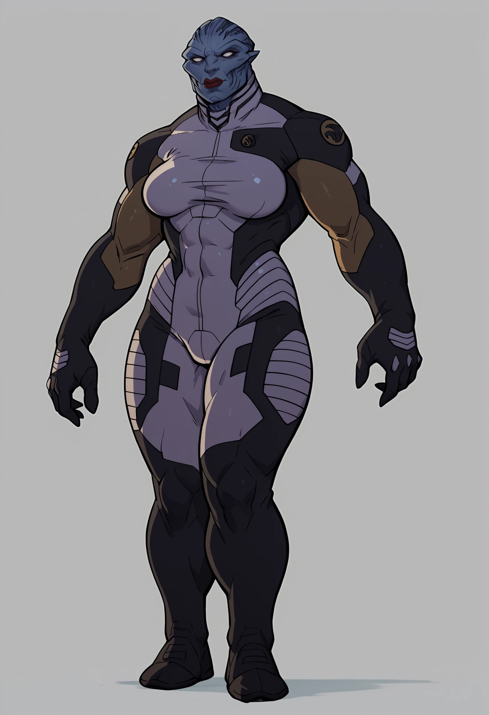 1girl, breasts, colored skin, blue skin, white eyes, muscular, alien, thighs, lipstick, bodysuit