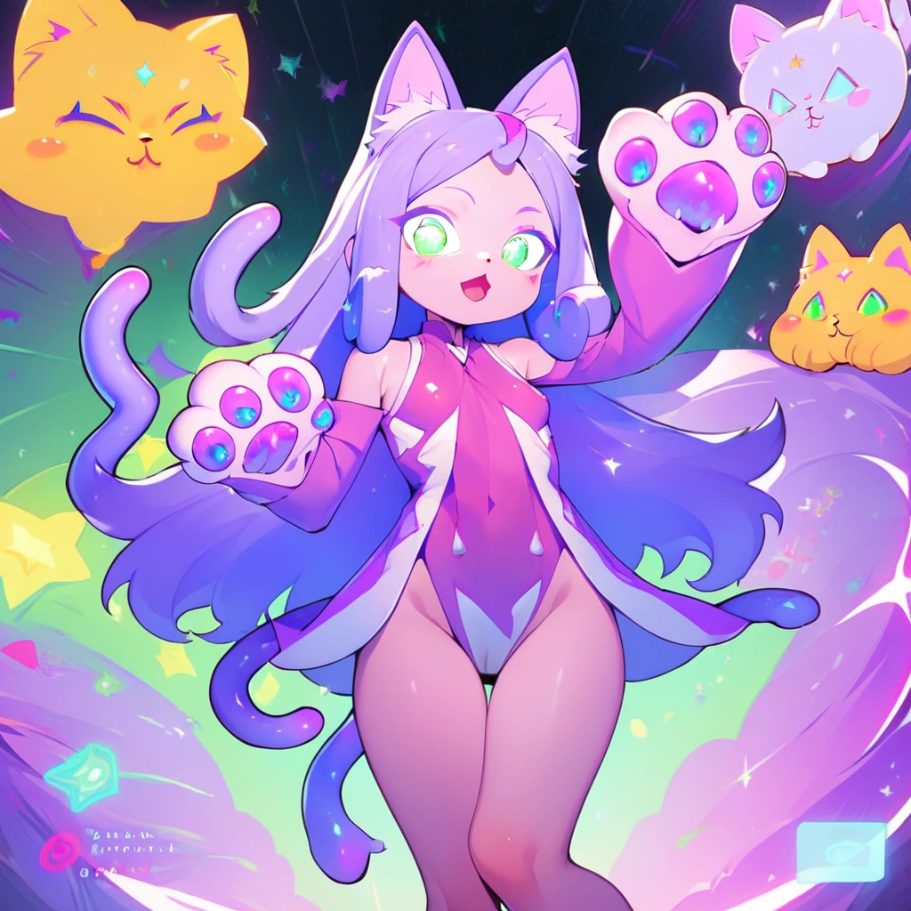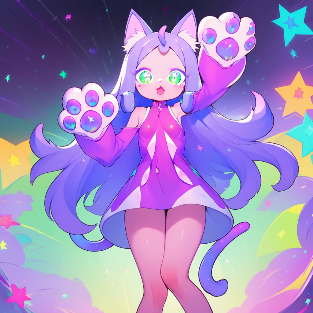 Doranana, glowing eyes, star shaped pupils, small breast, colored skin, light purple skin, skinny body, slim legs, furry, female furry, animal hands, animal ears, cat ears, animal ear fluff, cat tail, animal feet, green eyes, parted bangs, long bangs, purple hair, long hair, ahoge,