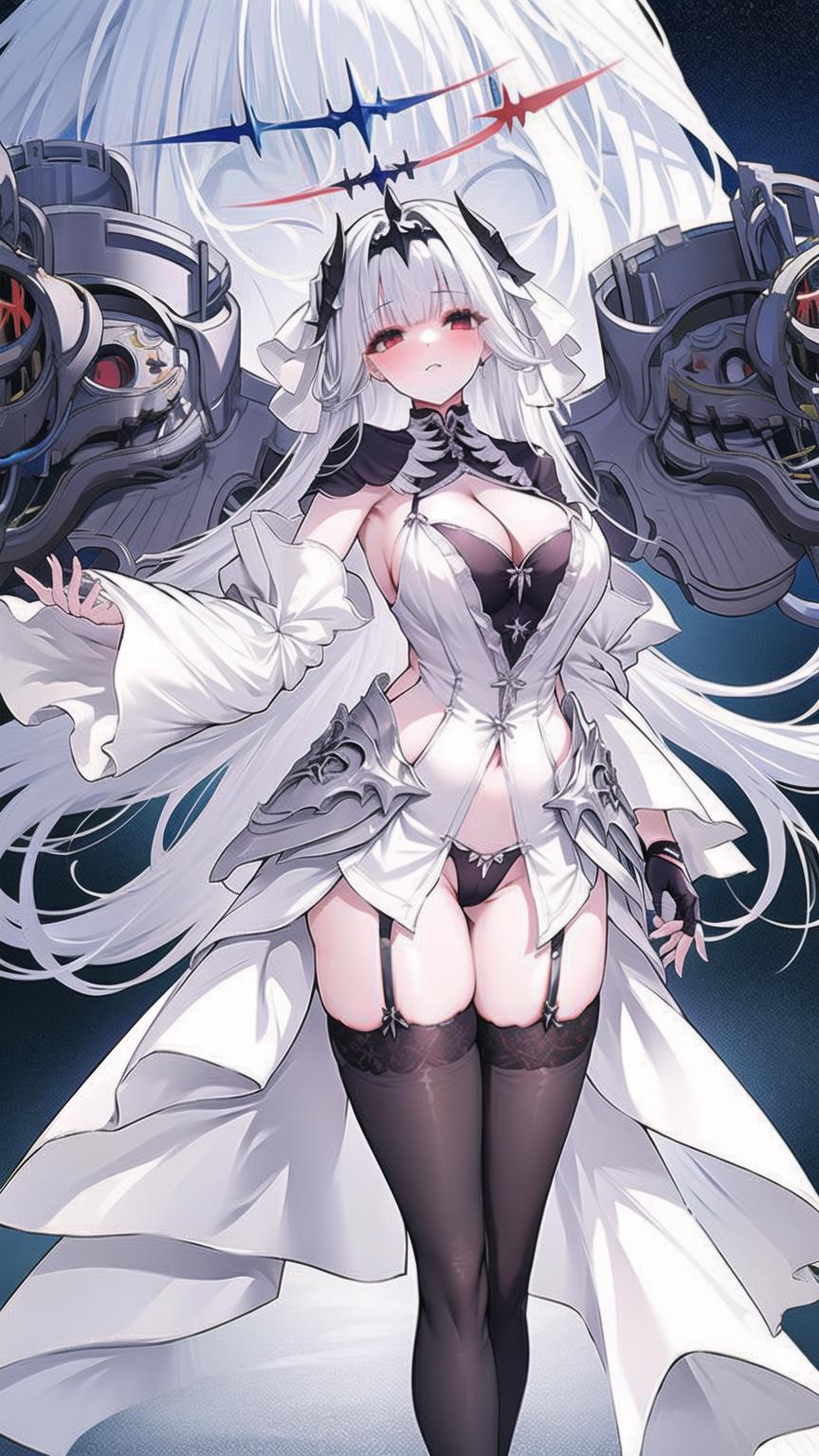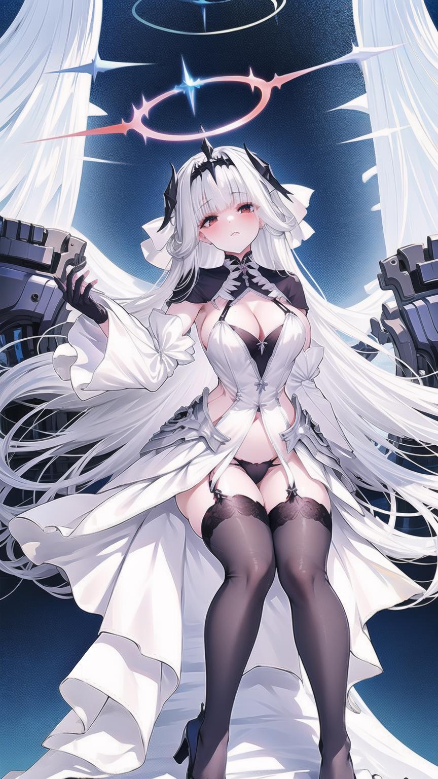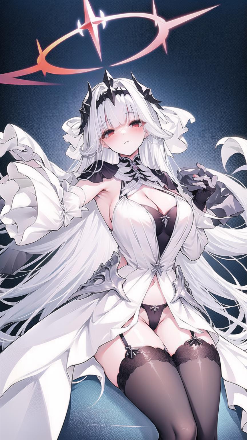 -->Prompts: marseillais, breasts, gloves, halo, fingerless gloves, black thighhighs, red eyes, white dress, black panties, underwear, panties, wide sleeves, garter straps, horns,