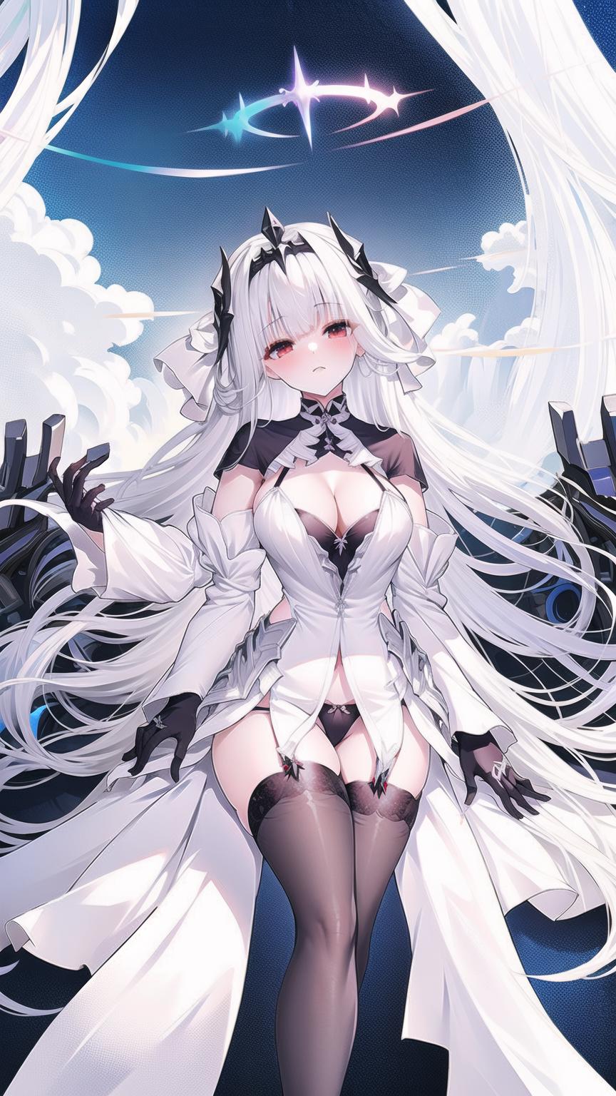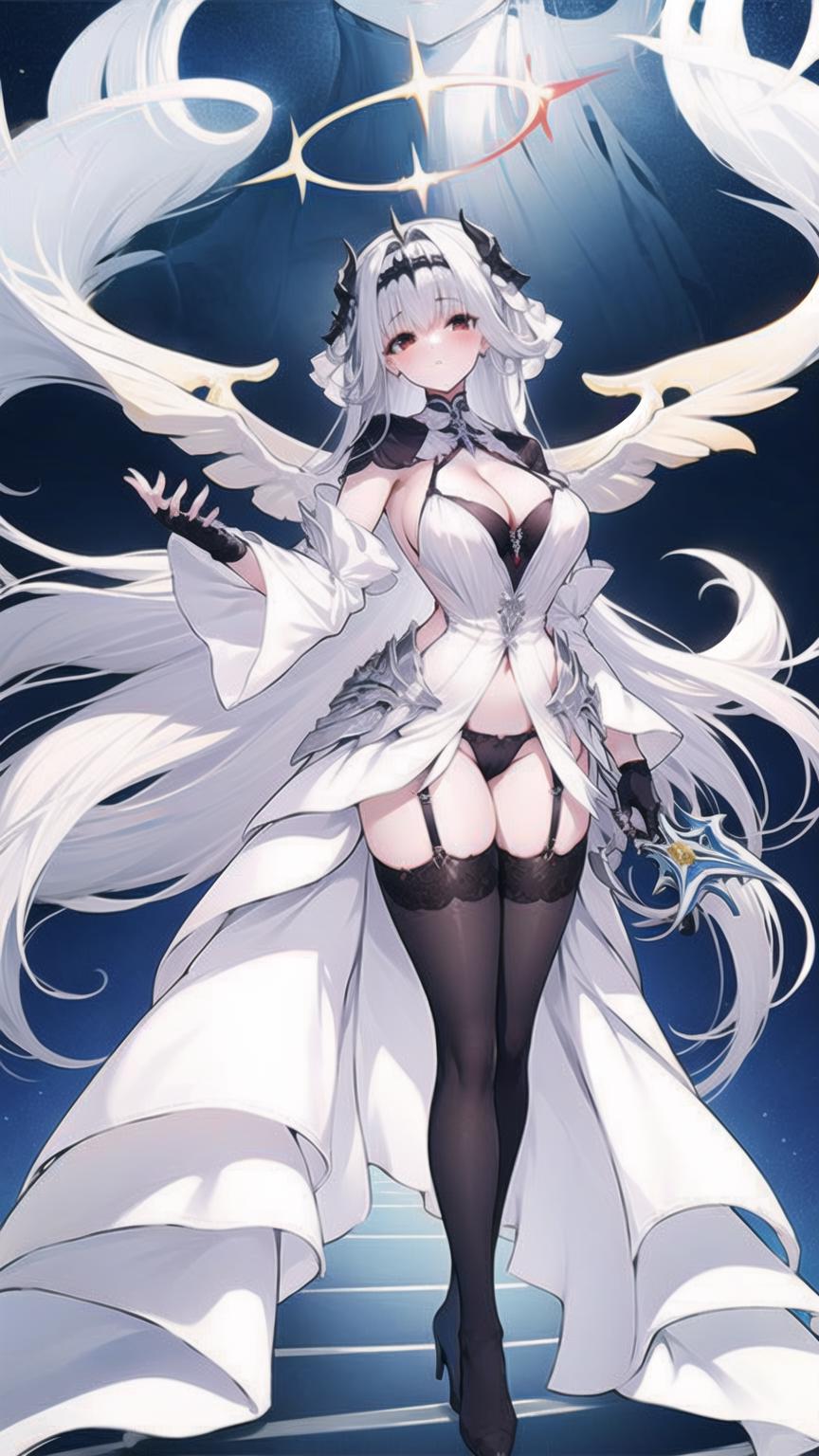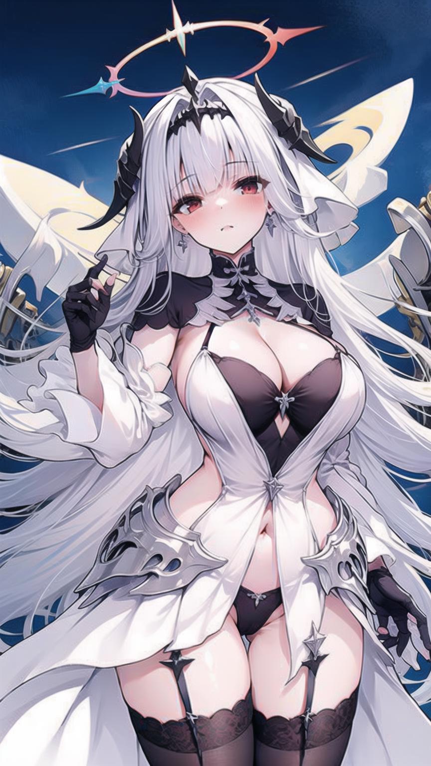 -->プロンプト:marseillais, breasts, gloves, halo, fingerless gloves, black thighhighs, red eyes, white dress, black panties, underwear, panties, wide sleeves, garter straps, horns,