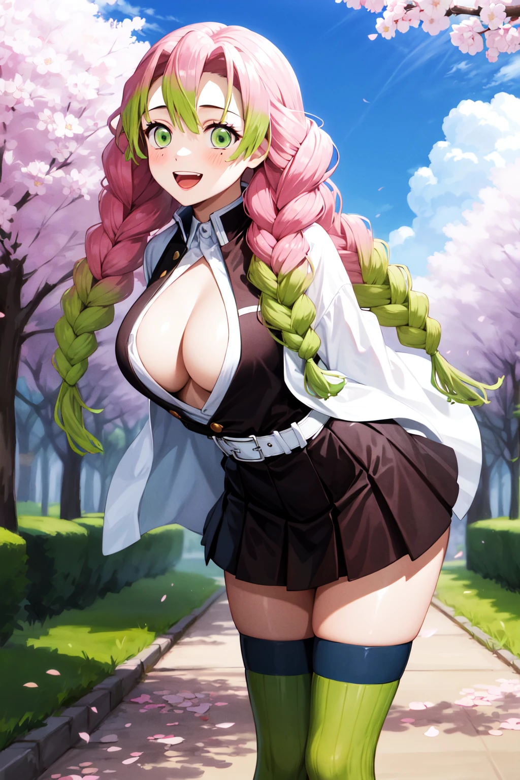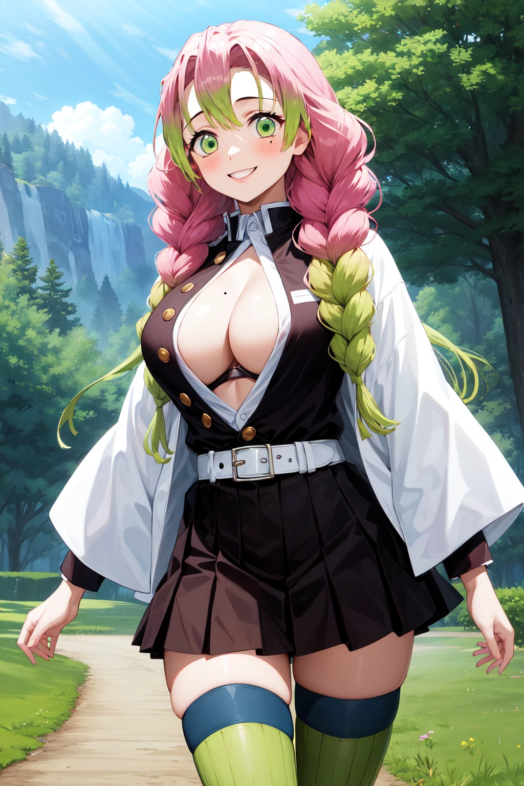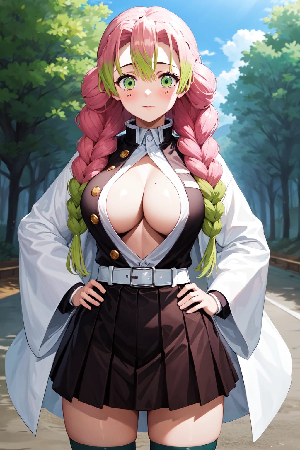 aamitsuri, long hair, braid, multicolored hair, green eyes, mole under eye, large breasts, japanese clothes, cleavage, white jacket, haori, black shirt, open clothes, belt, pleated skirt, (black skirt:1.2), green thighhighs, ribbed legwear