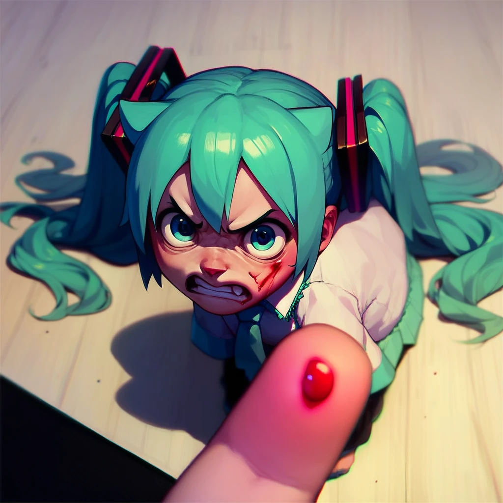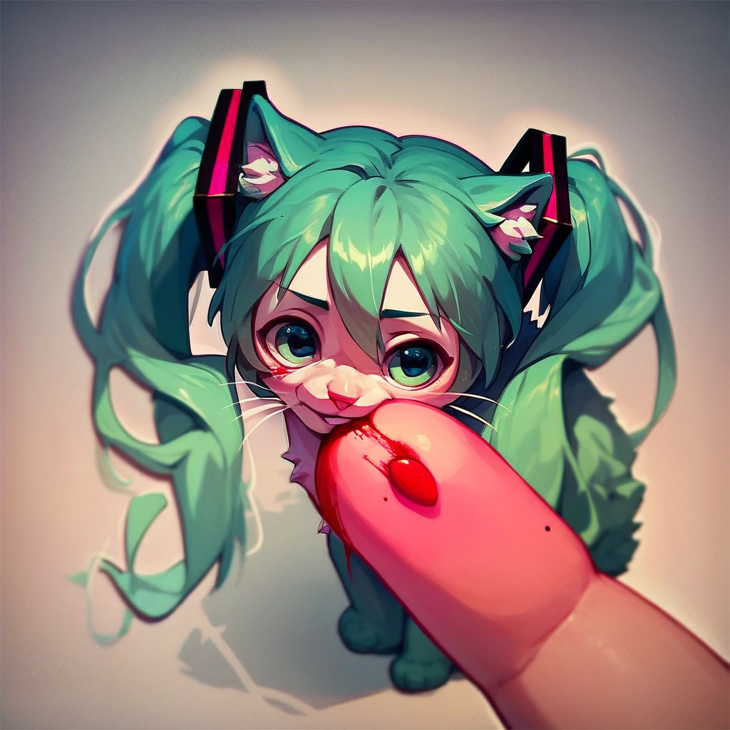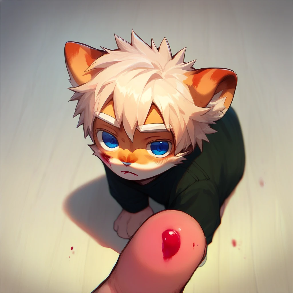 a small kitten is sitting on the floor, finger, blood
