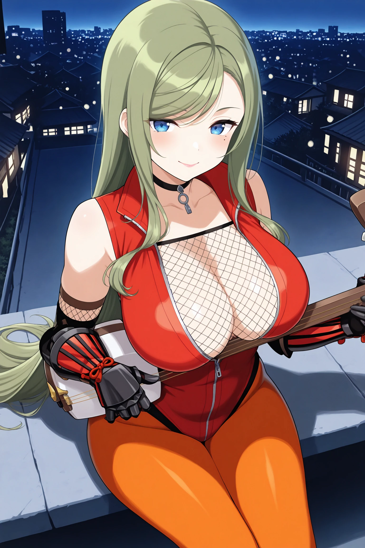 outfit2, black choker, red bodysuit, sleeveless bodysuit, partially unzipped, fishnet top, black gloves, elbow gloves, gauntlets, orange pantyhose