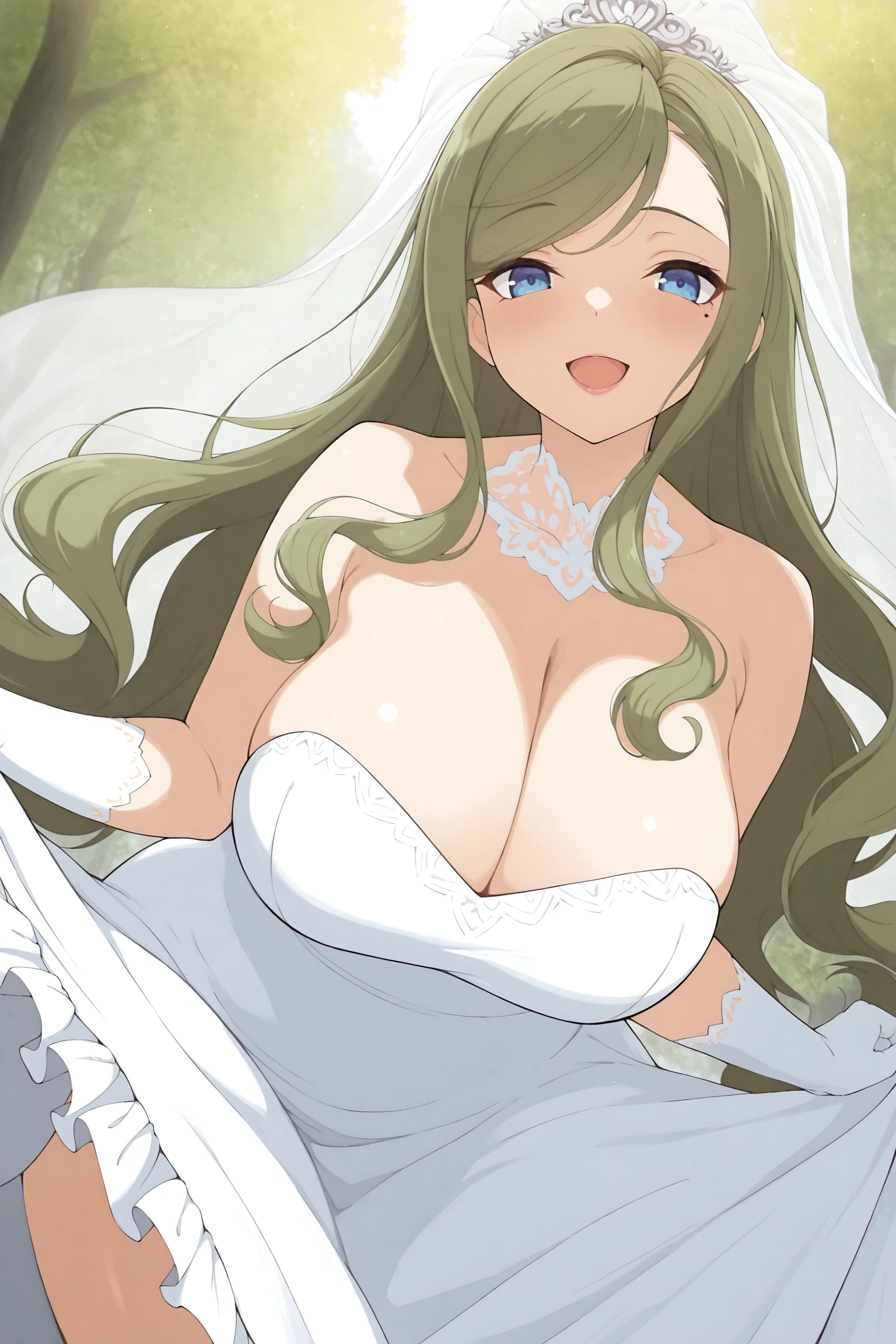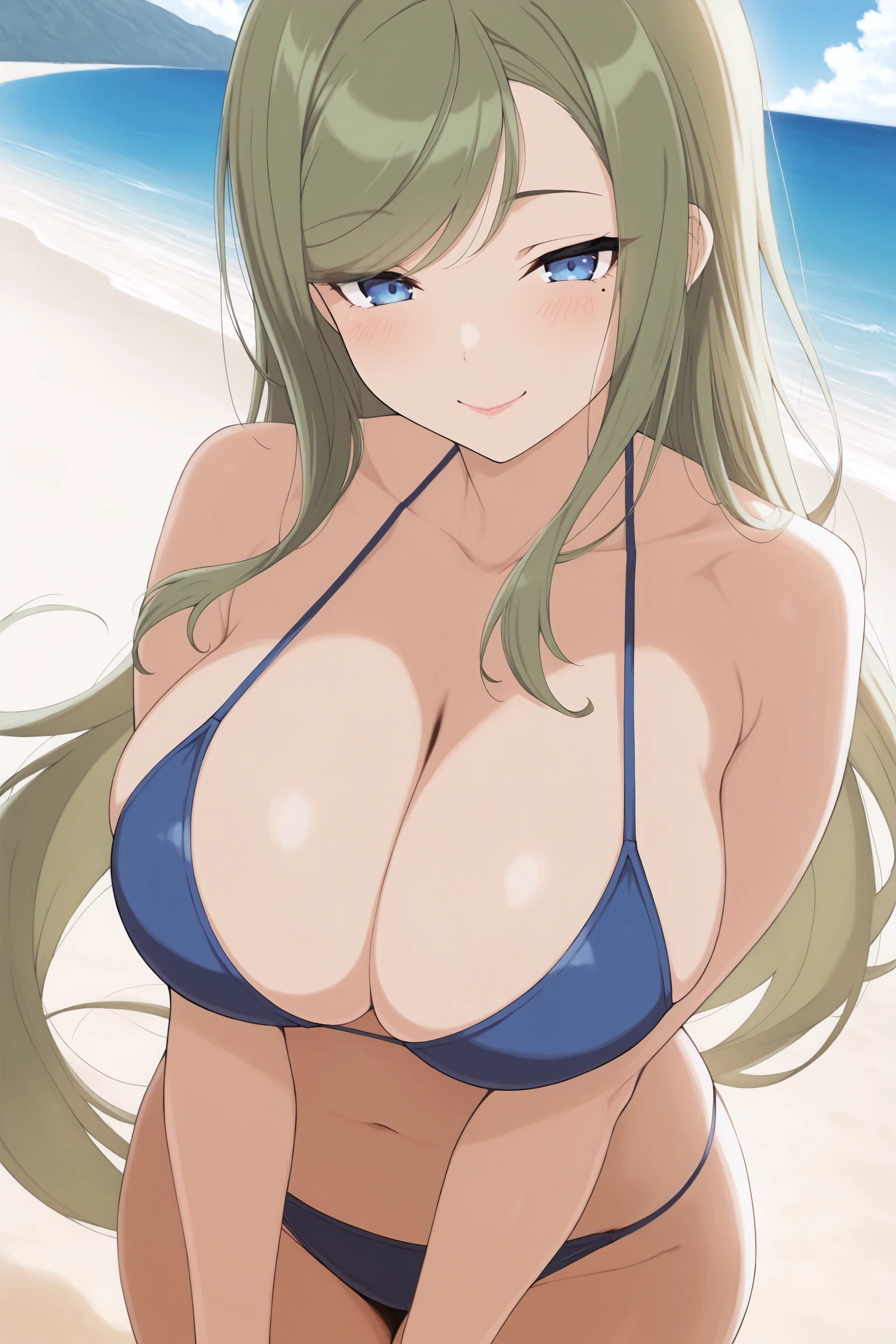green hair, swept bangs, sidelocks, very long hair, blue eyes, mole under eye