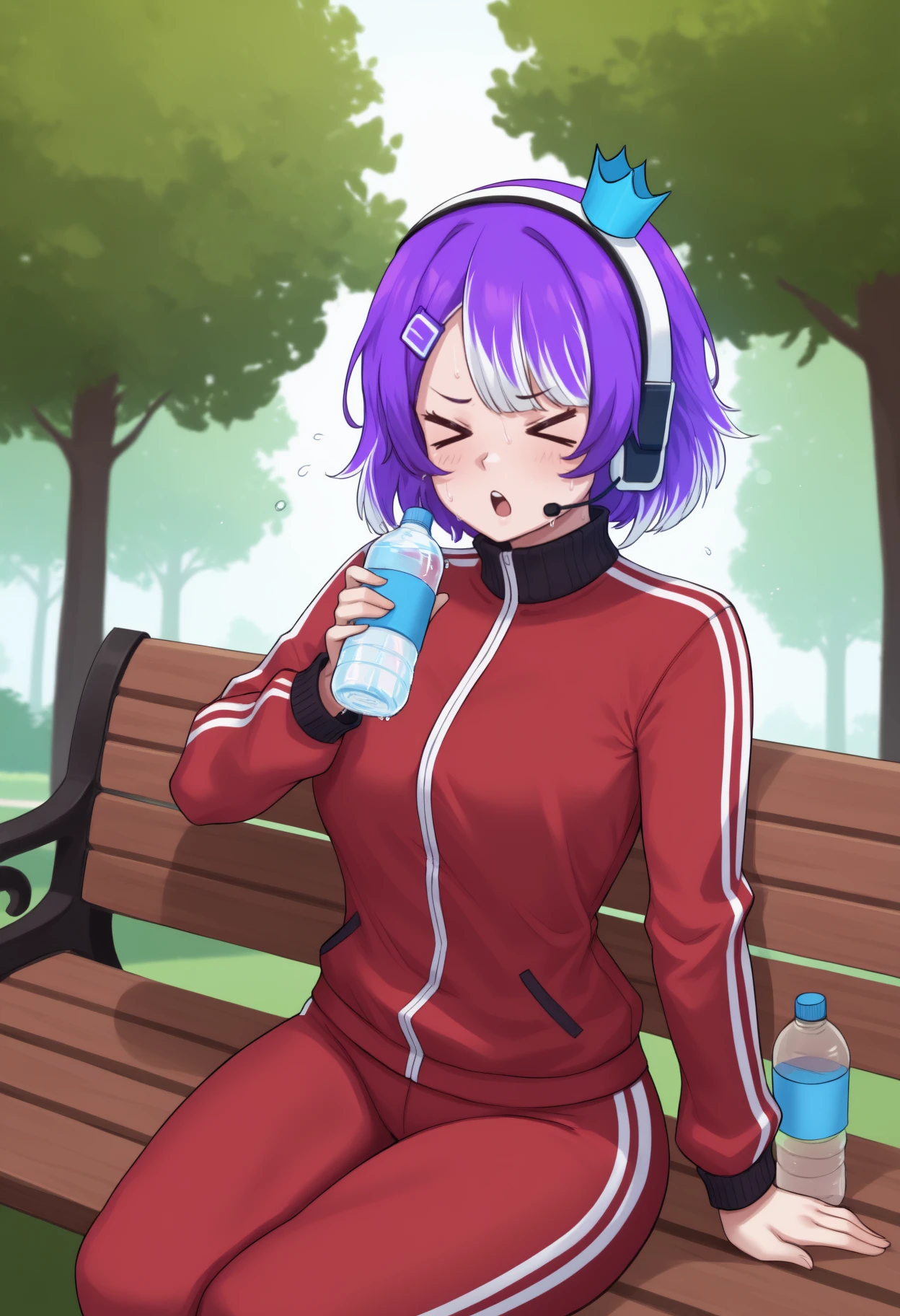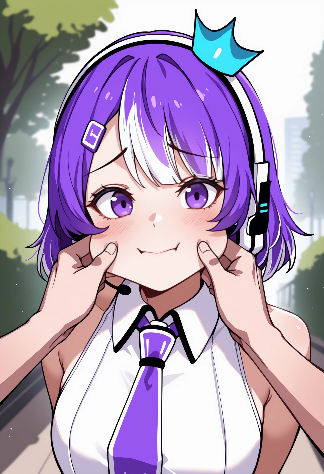 Trigger + Appearance: twtvchan, short hair, multicolored hair, purple hair, white hair, hairclip, purple eyes