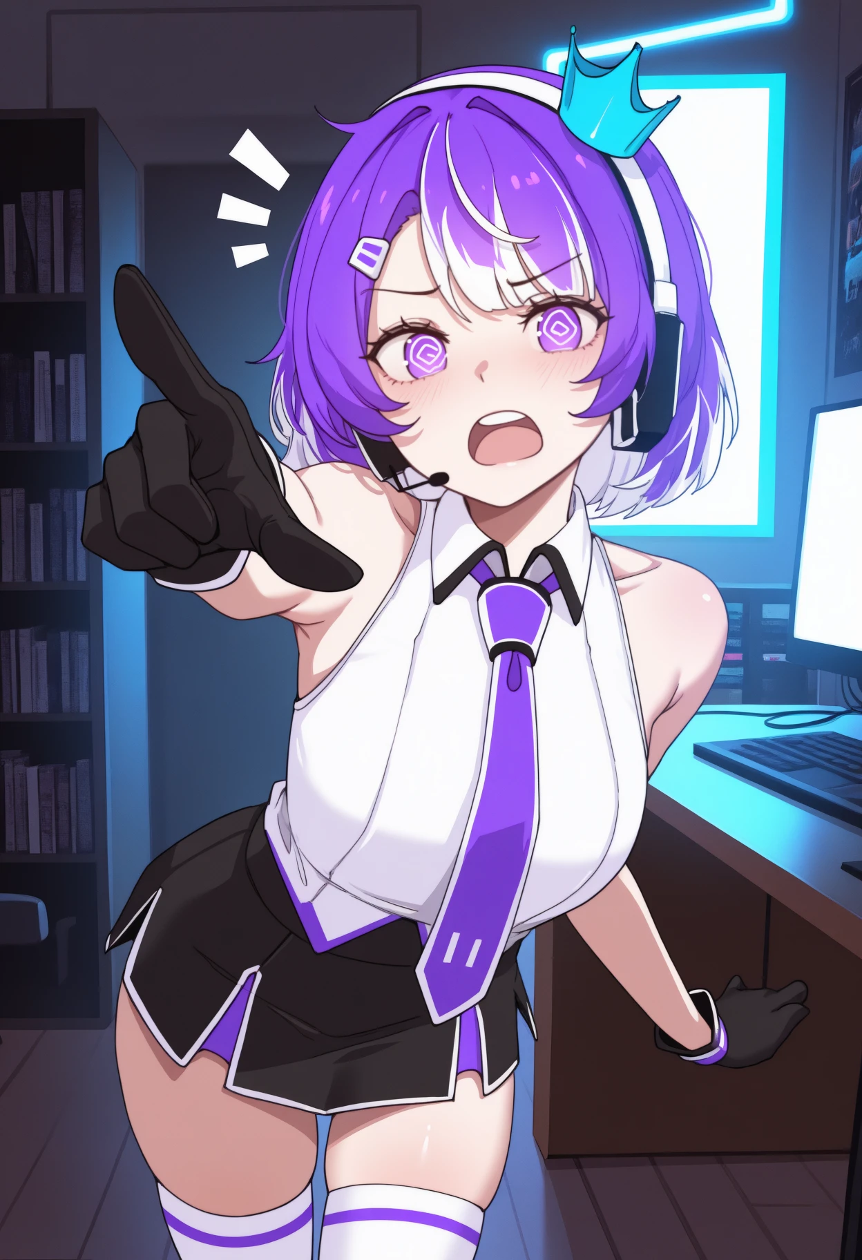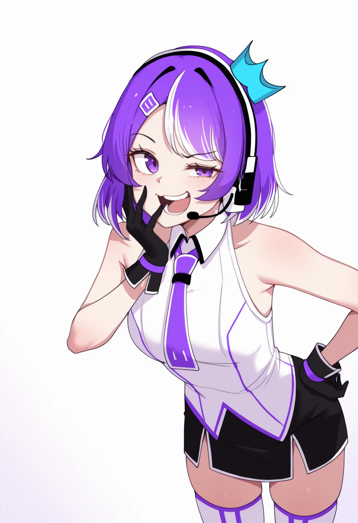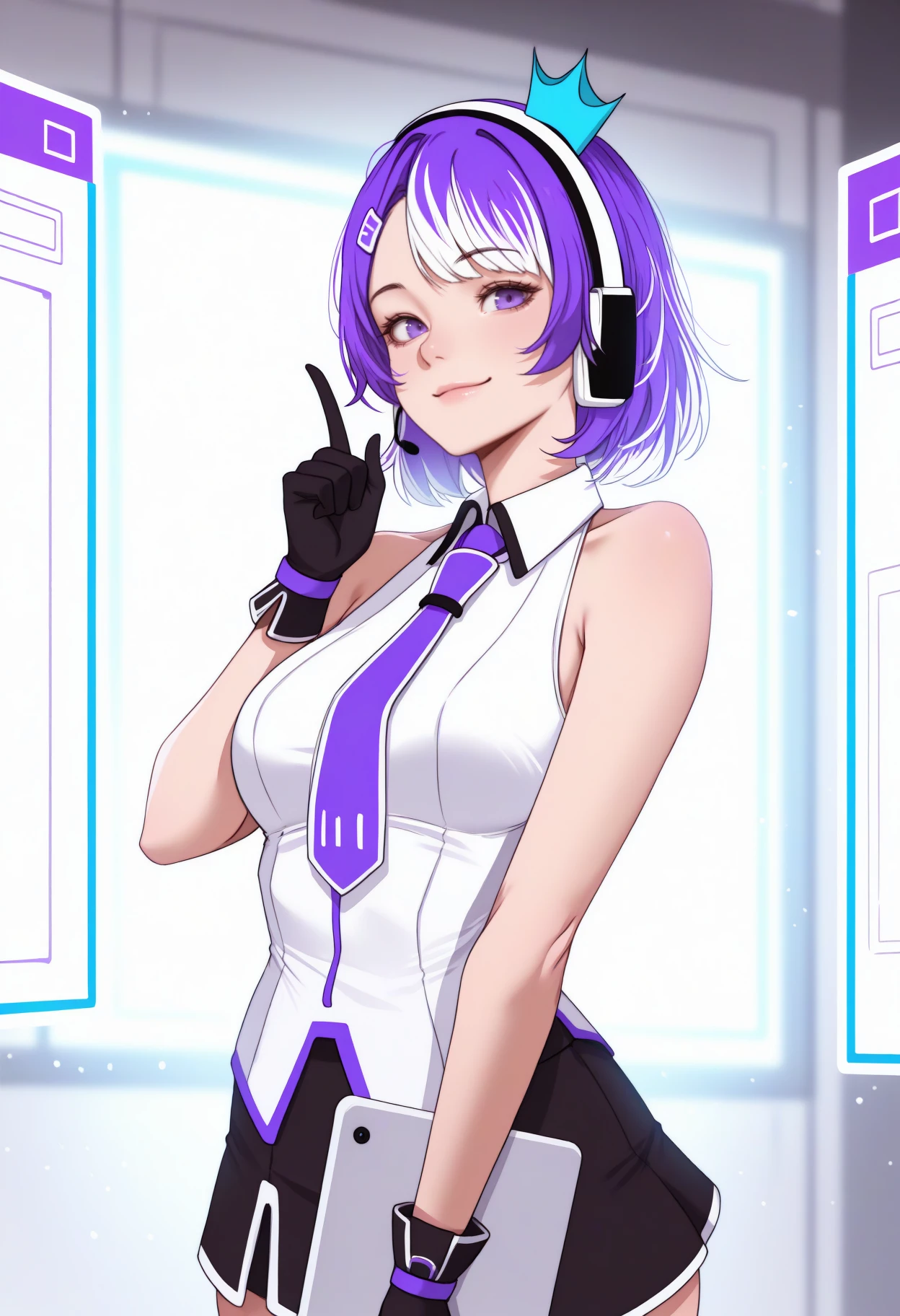 blue headwear, mini crown, headset, white shirt, collared shirt, sleeveless shirt, purple necktie, black gloves, black skirt, miniskirt, white thighhighs, bare shoulders