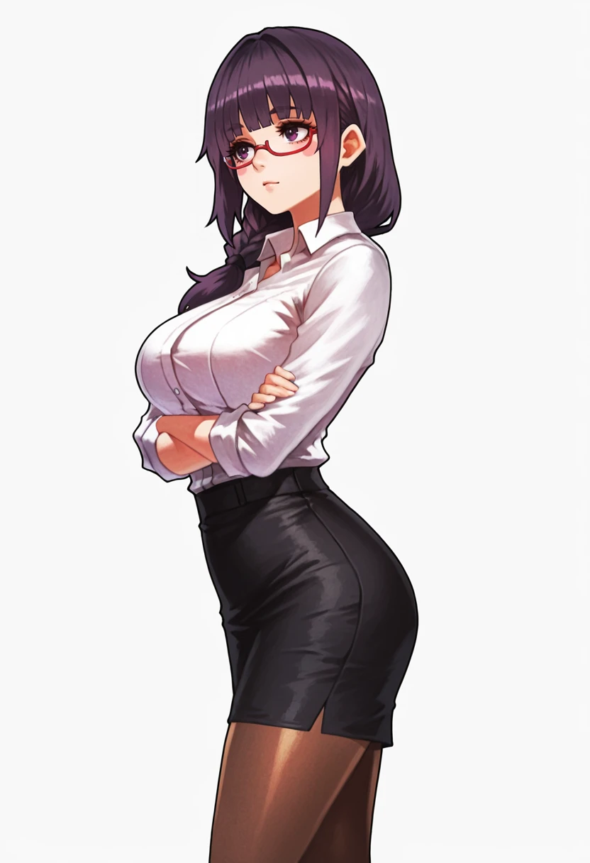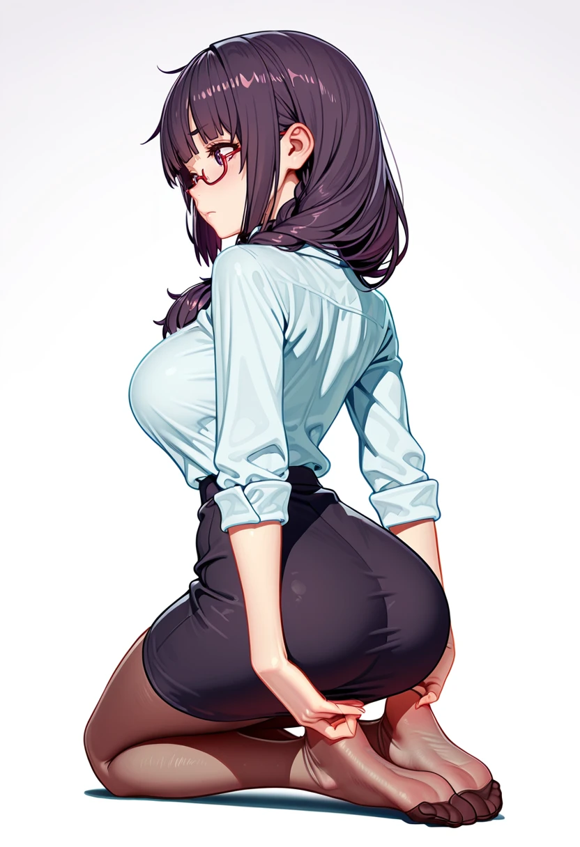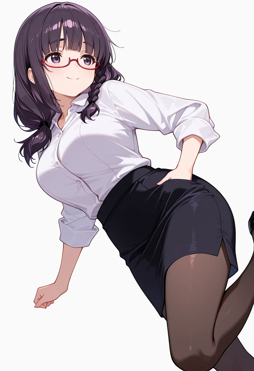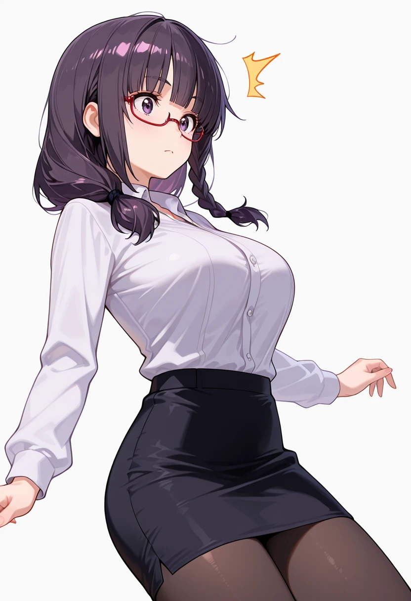 white collared shirt, dress shirt,black pencil skirt, pantyhose,red-framed eyewear, under-rim eyewear, office lady, Explanation and notes below👇