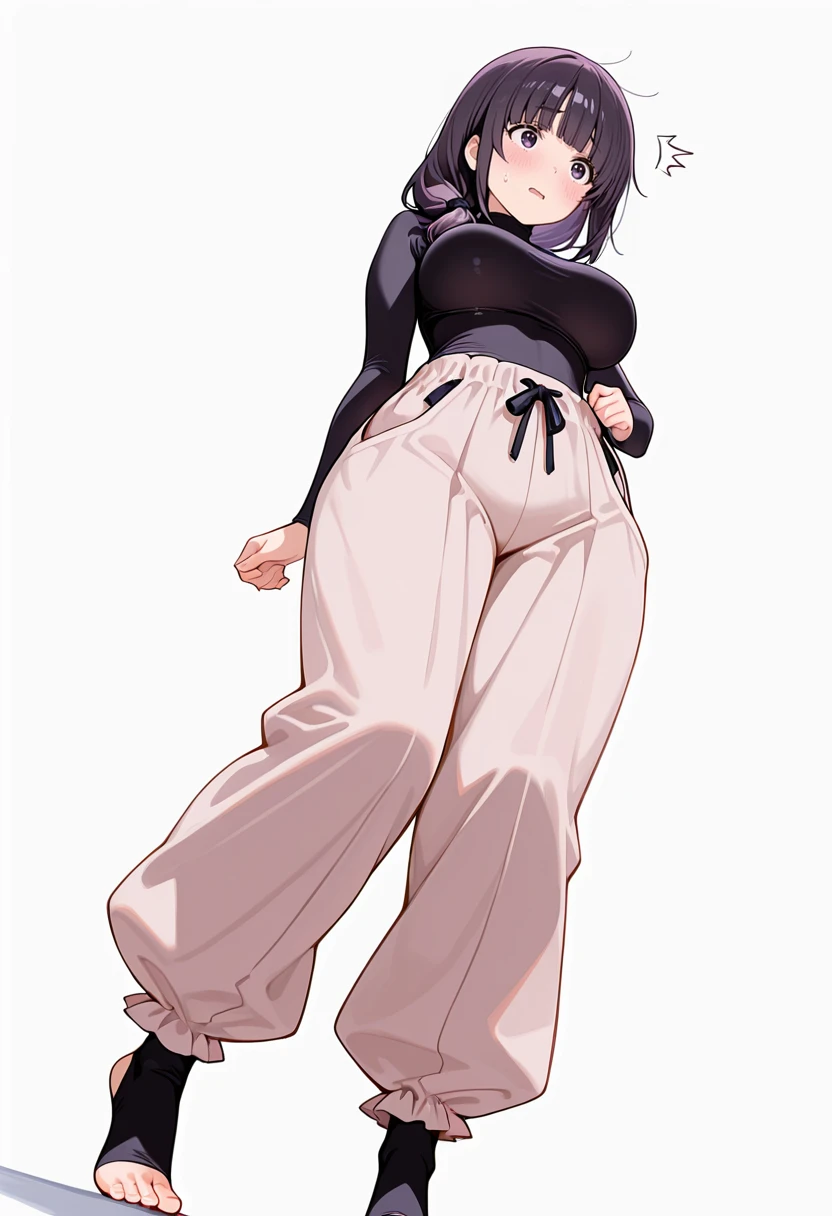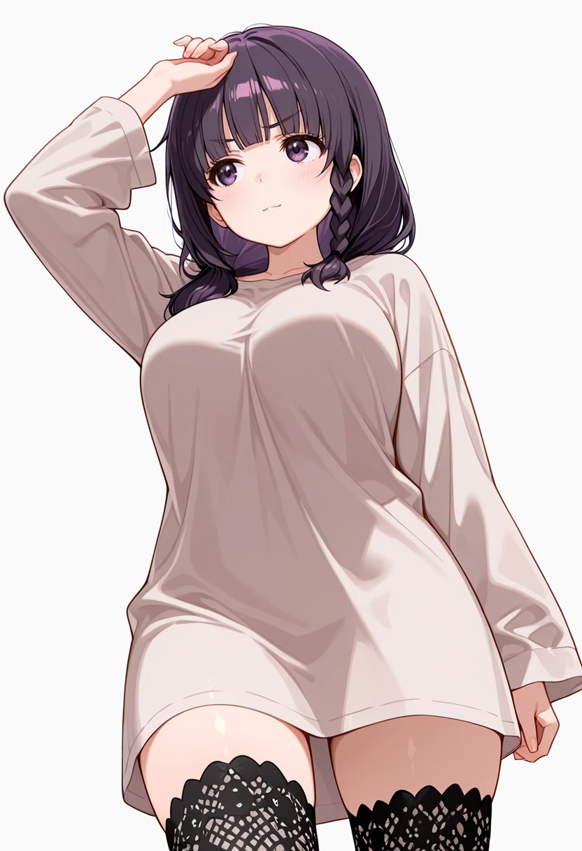 mayu_cnr, 1girl,purple hair, long hair, braid,single braid, blunt bangs, hair over shoulder, purple eyes, large breasts, 👗Default Outfit