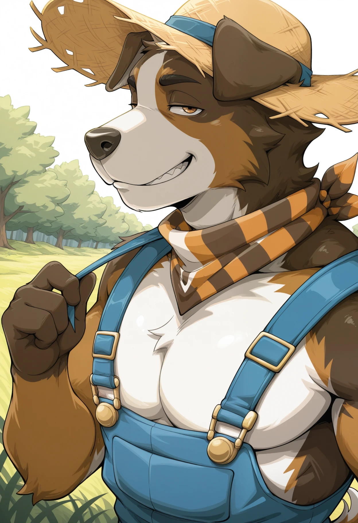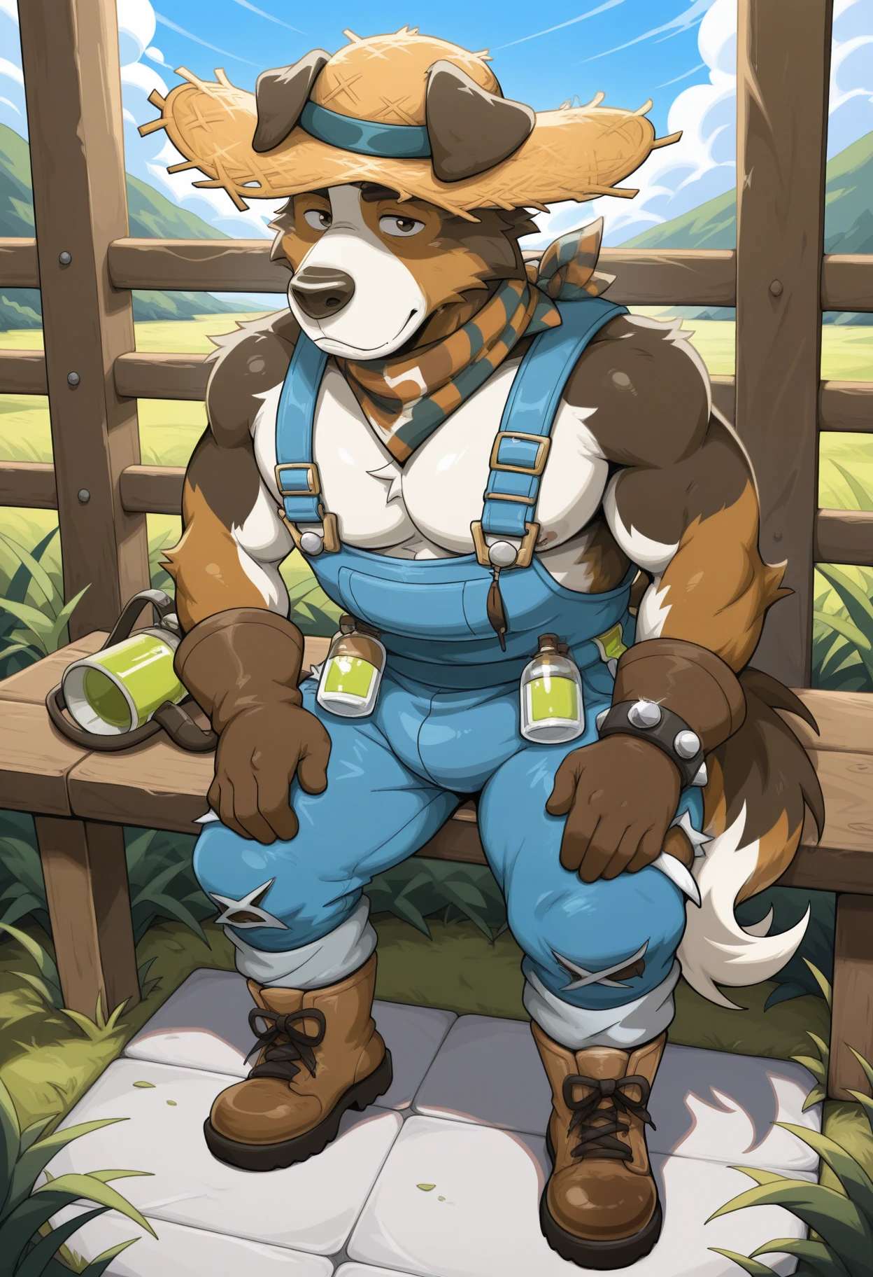 Main outfit: straw hat, diamond-shaped earrings, bandana, blue overalls, brown gloves, bracelet, brown boots,
