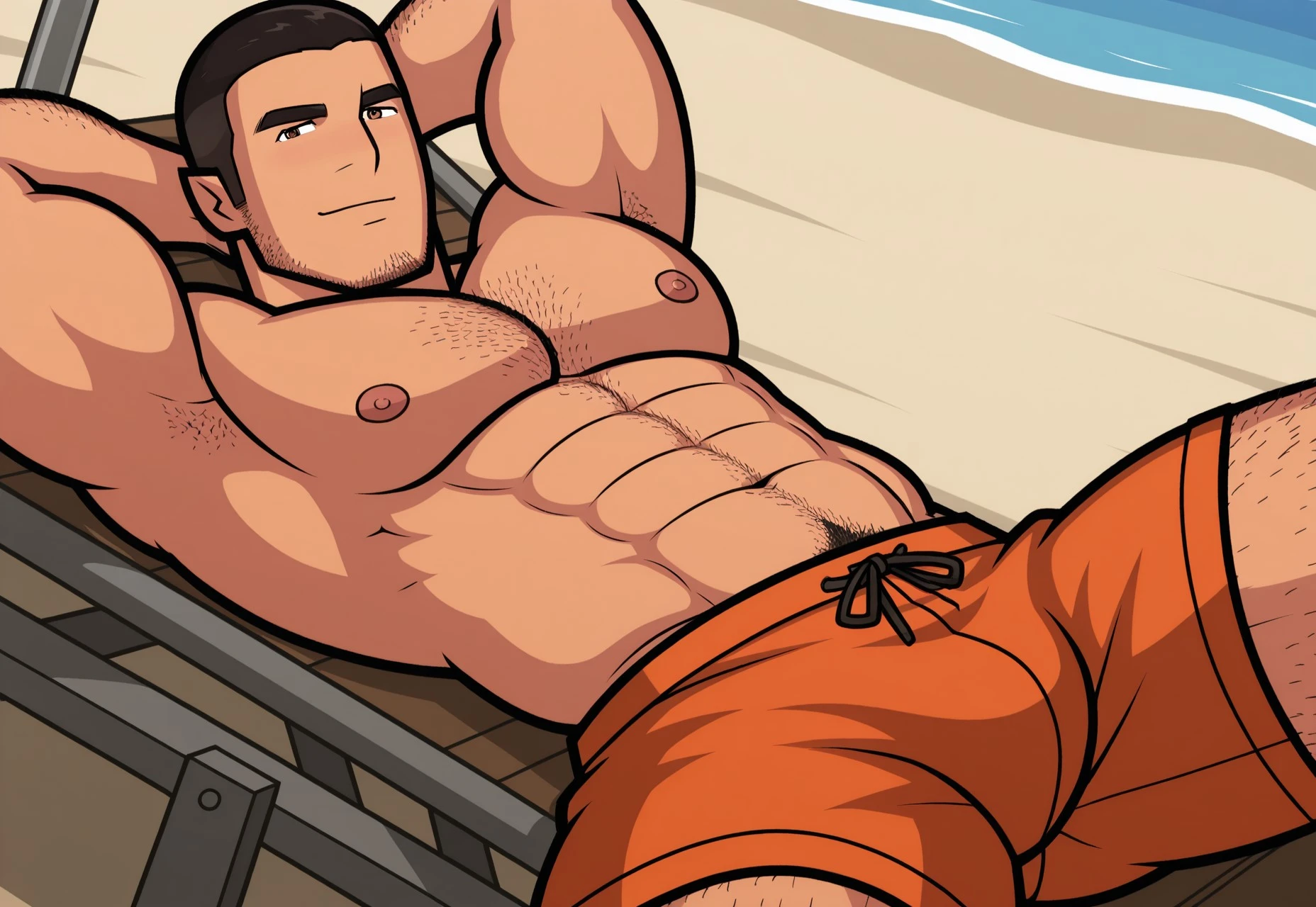 (body hair, abs hair, pubic hair, happy trail, navel hair),