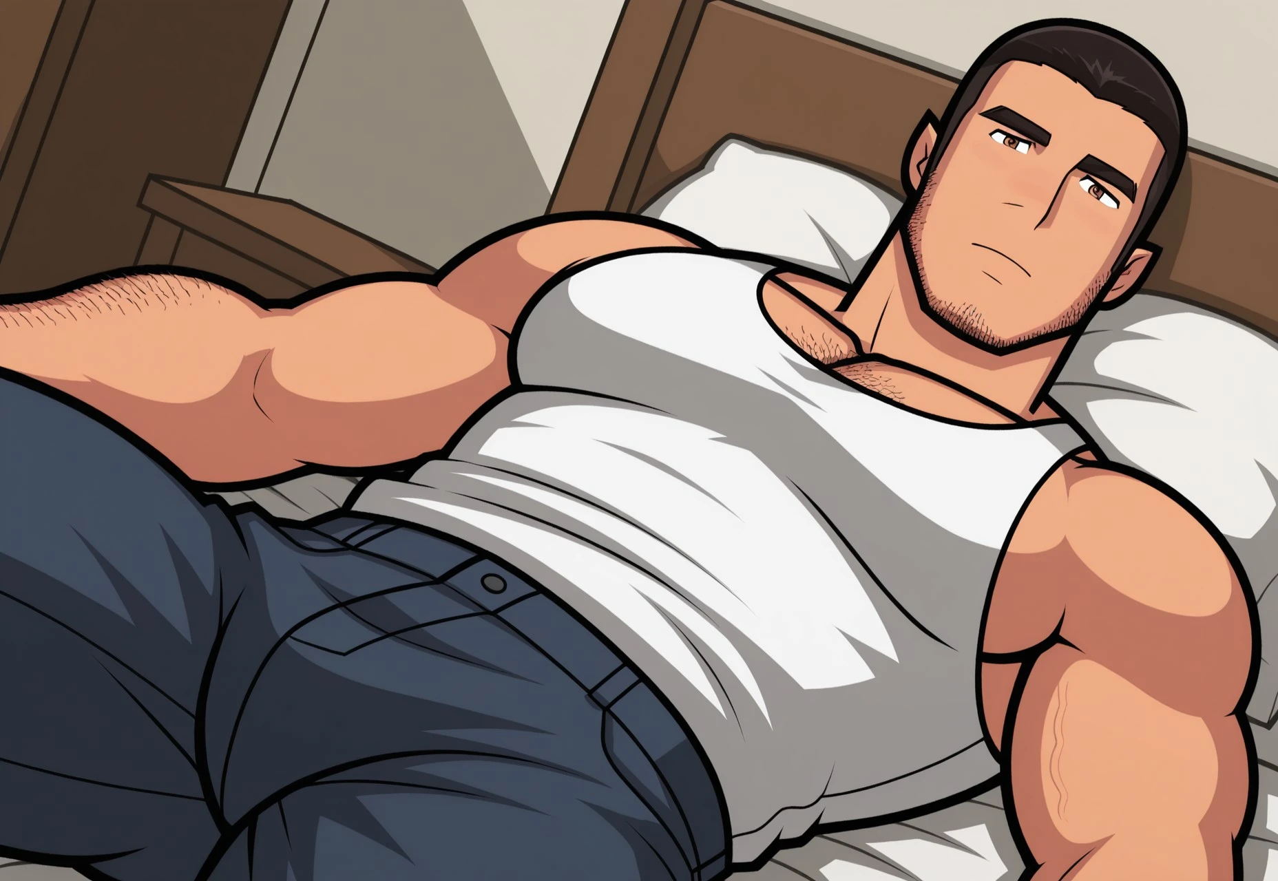hazel eyes, thick brows, sideburns, dark hair, slick-back hair, flat hair, facial hair, chin stubble, chest hair, arm hair,