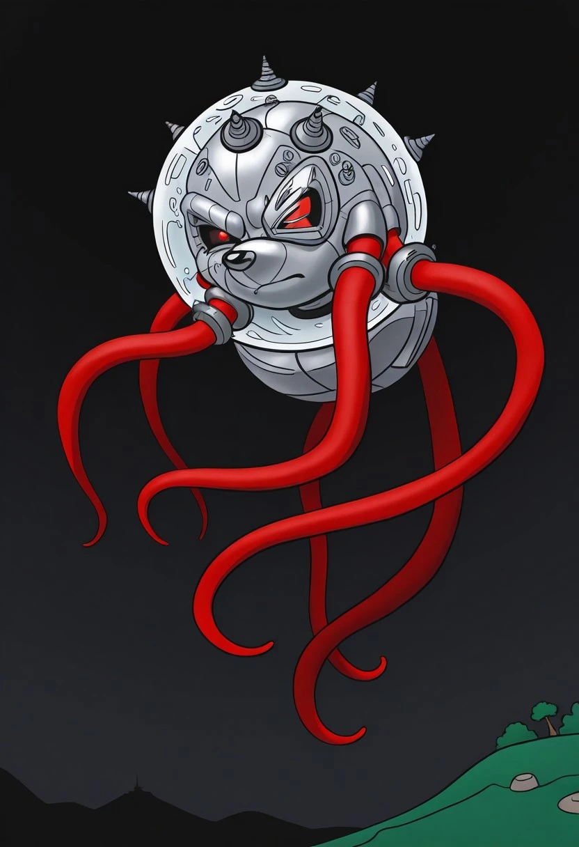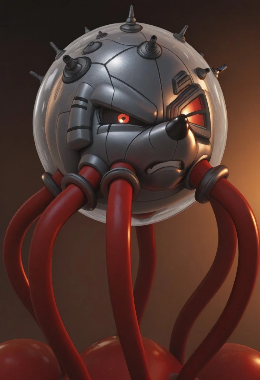 Dimitri, round body, gray body, black sclera, red pupils, glowing red cybernetic eye, black furry nose, red tentacles