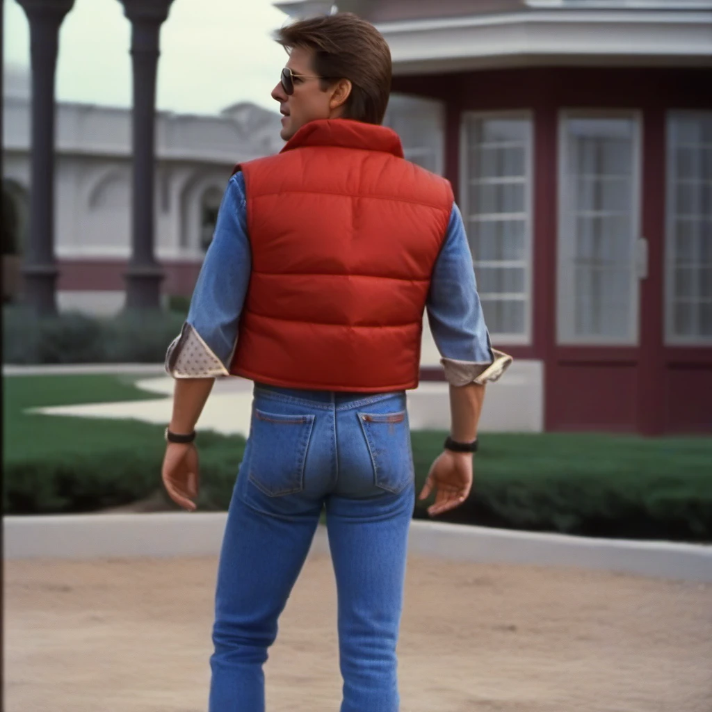 with a jeans shirt and pants, red sleeveless vest, with sunglasses , back to the future