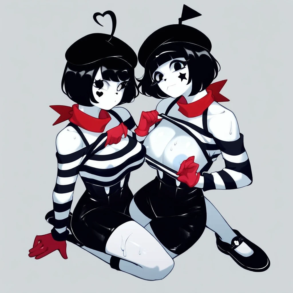 (BonBon_ChuChu, 2girls, short hair, black hair, heart ahoge, bob cut, white skin, beret, striped shirt, cleavage, bare shoulders, long sleeves, black shorts, red gloves, red scarf, star (symbol), heart (symbol), shoes),