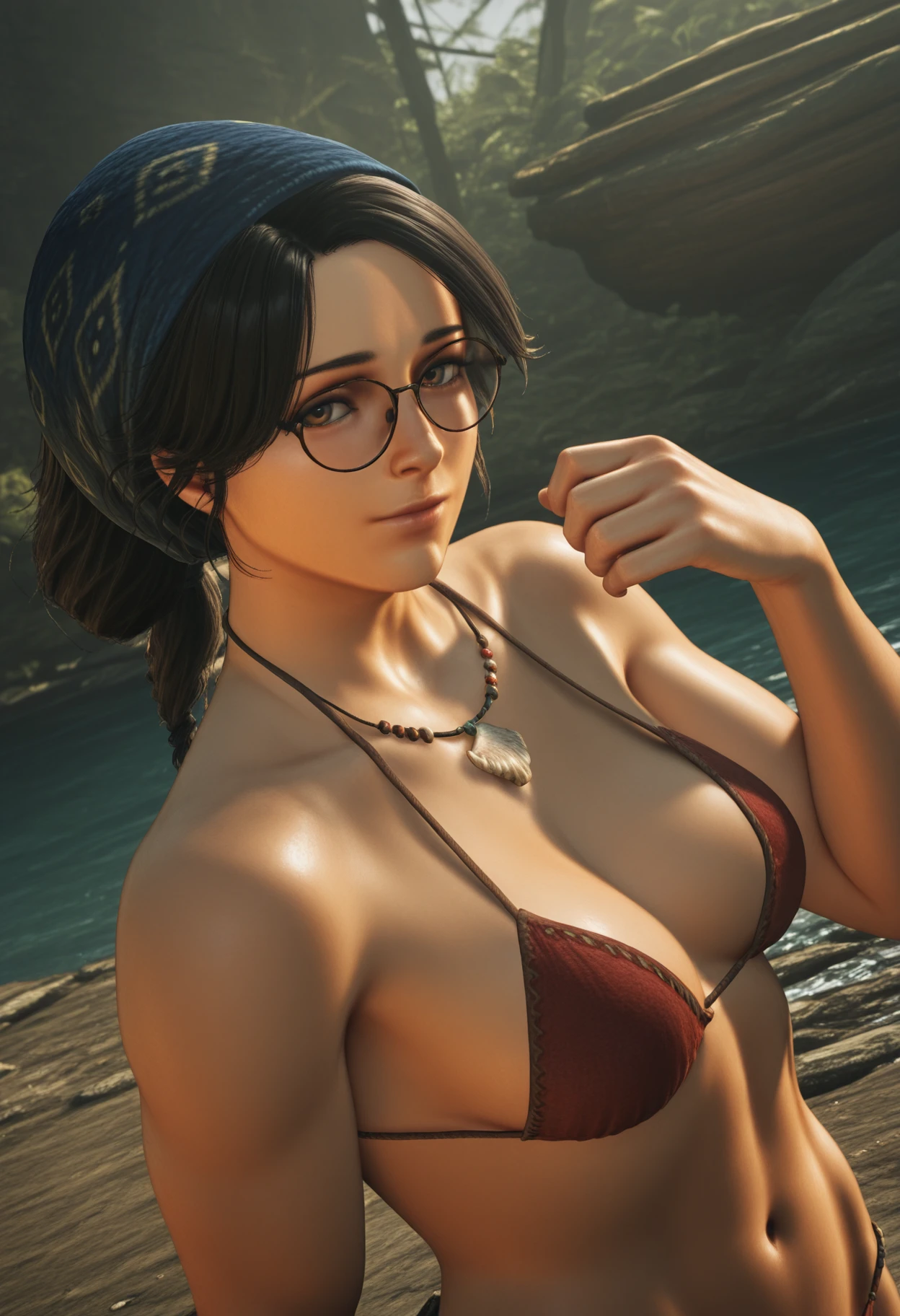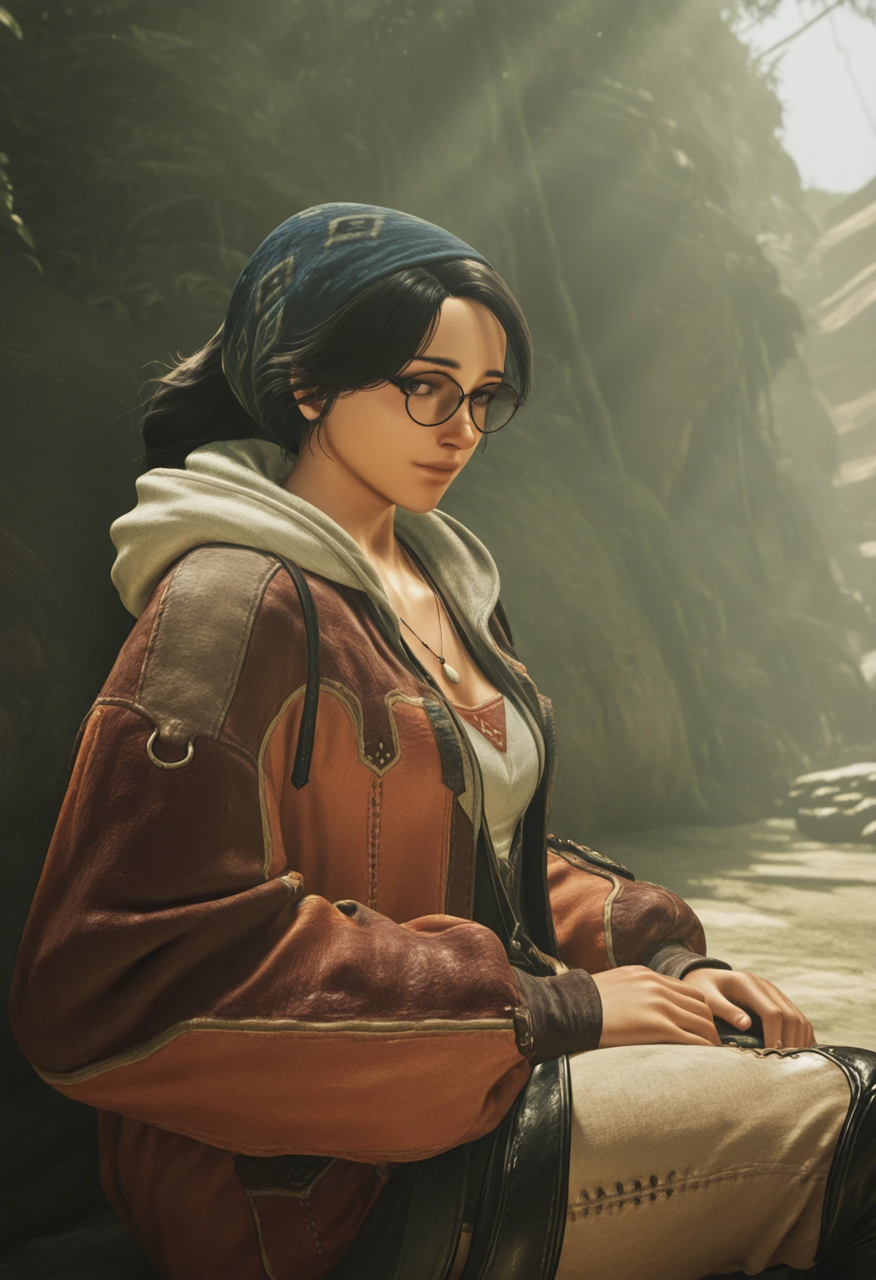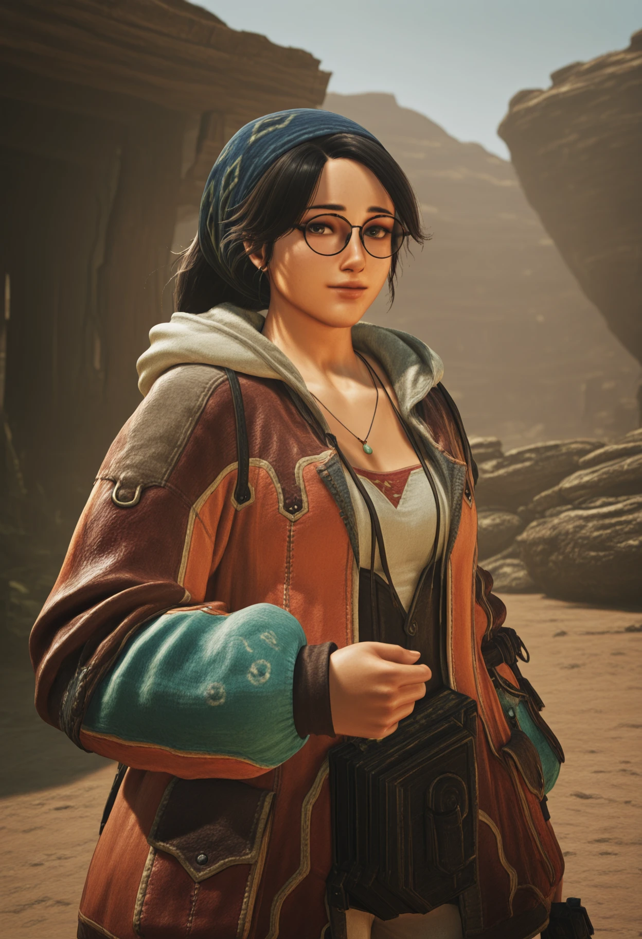 Triggerwords: alma, low ponytail, looking at viewer, parted bangs, short hair, black hair, brown eyes, forehead, blue headscarf, round eyewear, black-framed eyewear,