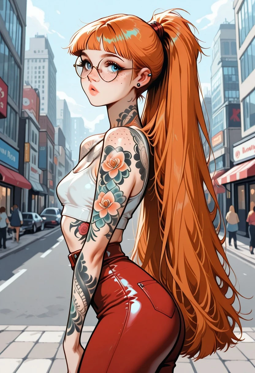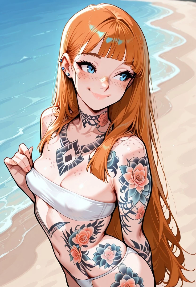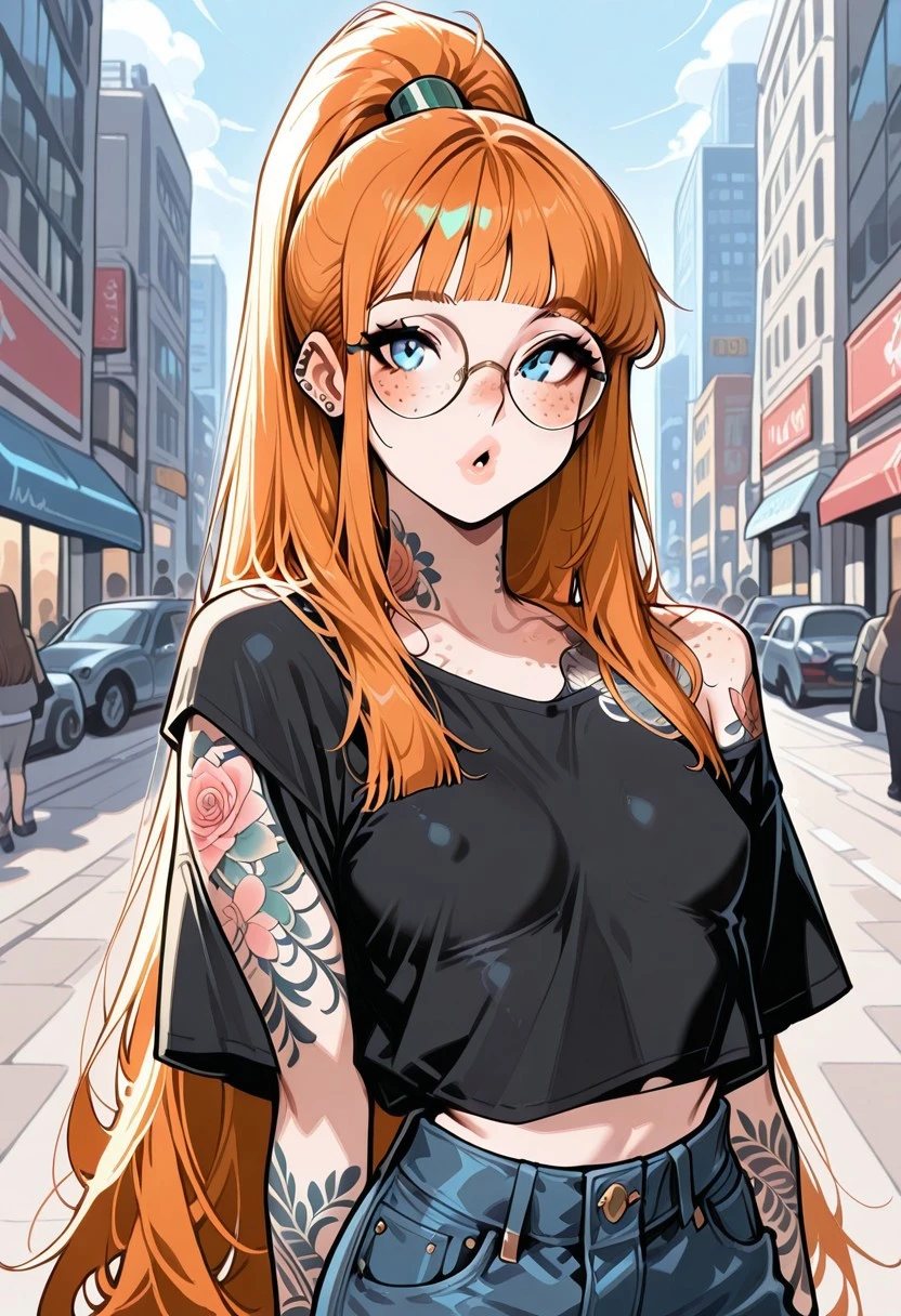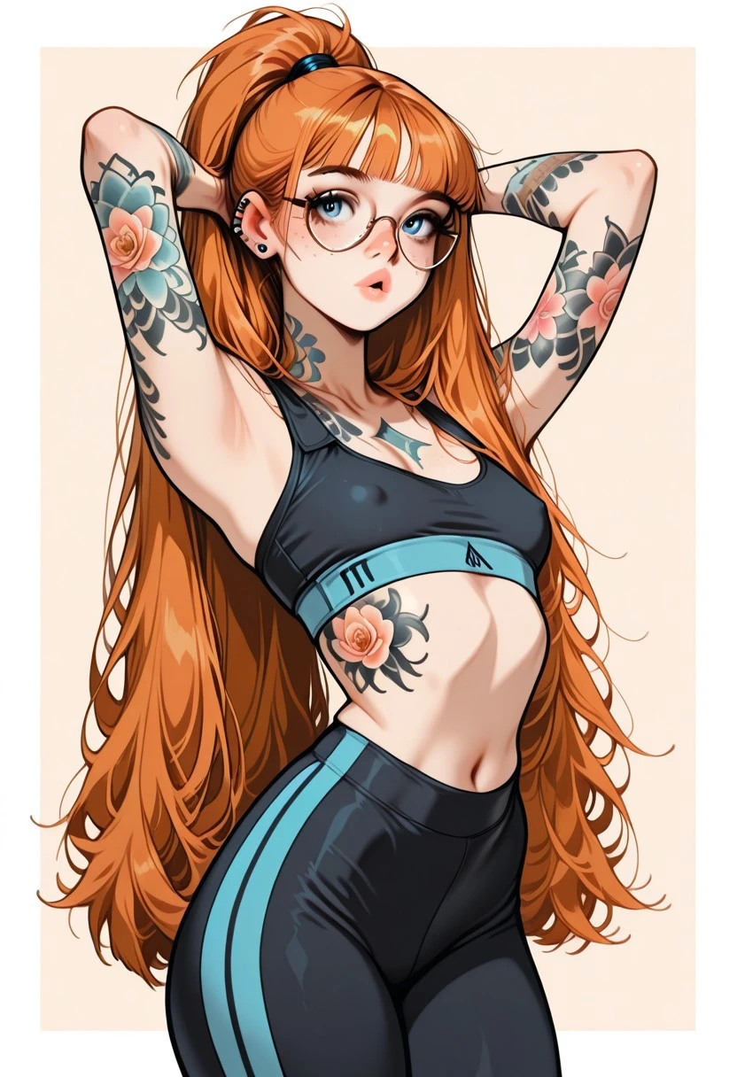 ginger hair, blunt bangs, double_tendrils, very long hair, high ponytail, straight hair, blue eyes, slim, small breasts, piercings, beautiful full lips, freckles, lot of freckles, small round mouth, tattoos, full-body tattoo, full arm tattoo