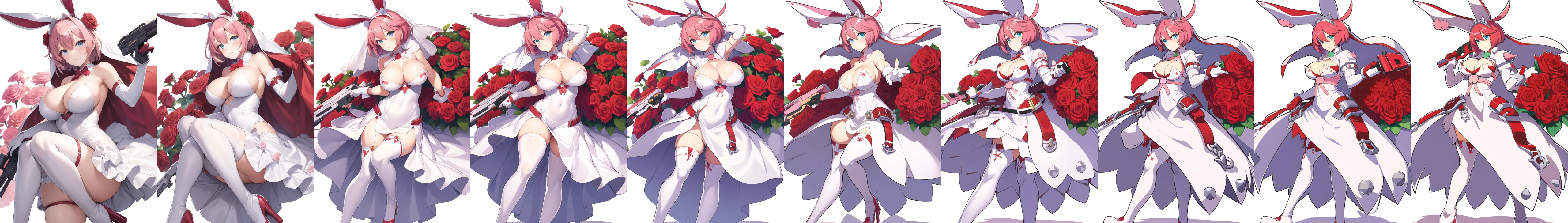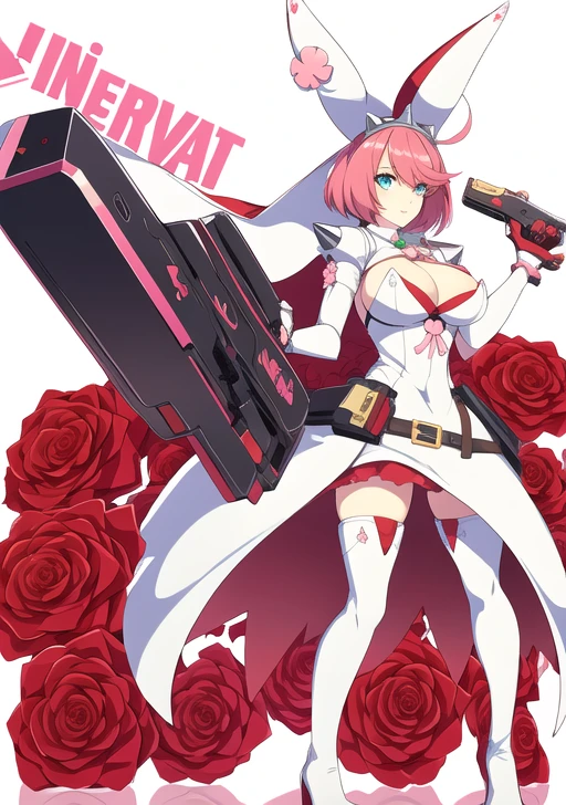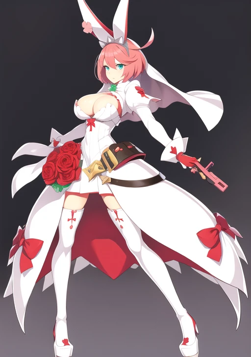prompt used : elphelt, 1girl, solo, breasts, short hair, blue eyes, large breasts, simple background, thighhighs, gloves, white background, dress, holding, animal ears, cleavage, full body, weapon, pink hair, flower, ahoge, hairband, boots, holding weapon, white dress, rabbit ears, high heels, gun, fake animal ears, rose, thigh boots, red flower, holding gun, veil, spikes, handgun, red rose, wedding dress, bridal veil, huge ahoge, clover, four-leaf clover
