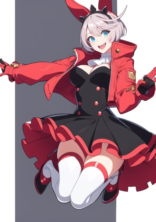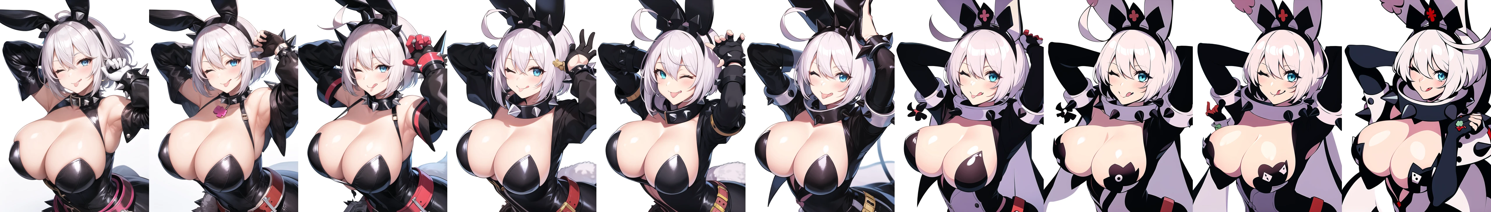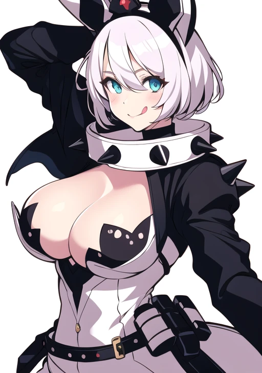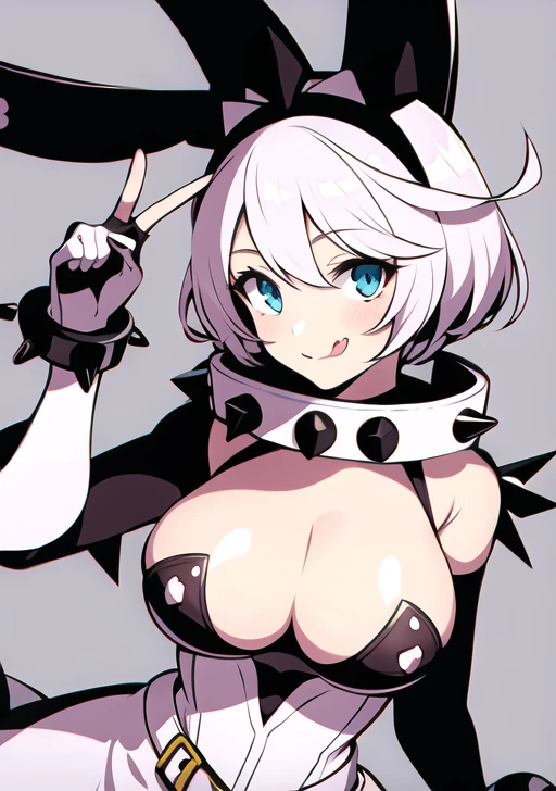 prompt used : elphelt, 1girl, solo, breasts, looking at viewer, smile, short hair, blue eyes, large breasts, simple background, gloves, white background, dress, animal ears, cleavage, hair between eyes, jewelry, ahoge, white hair, one eye closed, tongue, belt, tongue out, fingerless gloves, rabbit ears, collar, bracelet, fake animal ears, spikes, spiked bracelet, spiked collar, huge ahoge, ;p, clover, four-leaf clover