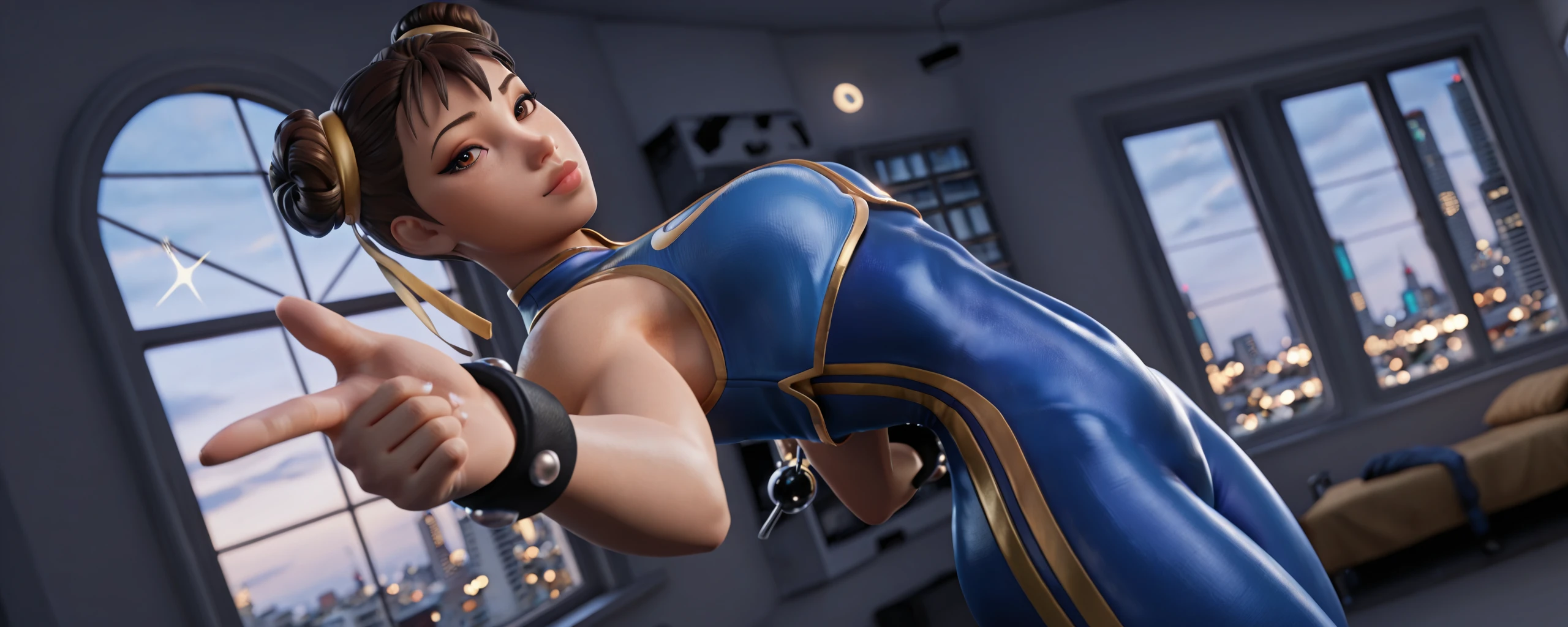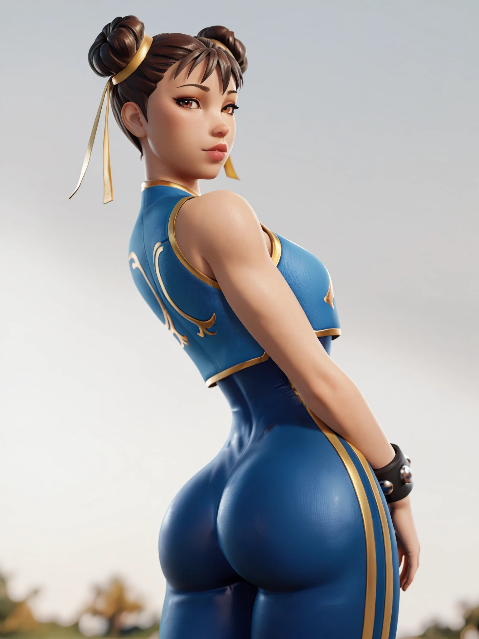 (ChunLiFN:1.1), chun li fortnite, brown hair, twin hair buns, brown eyes, thick thighs, athletic,
