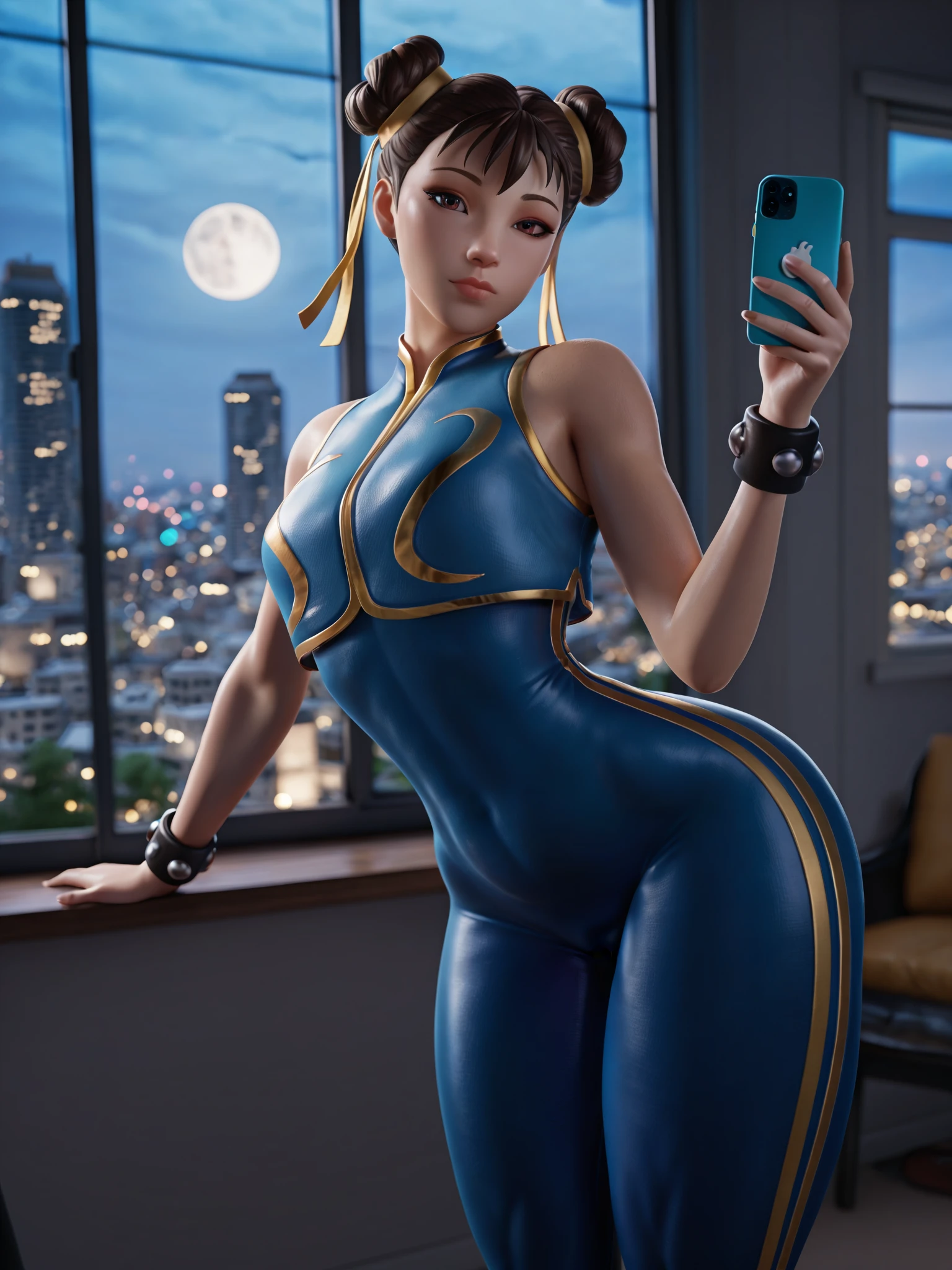 Prompt: (ChunLiFN:1.1), chun li fortnite, brown hair, twin hair buns, brown eyes, thick thighs, athletic,