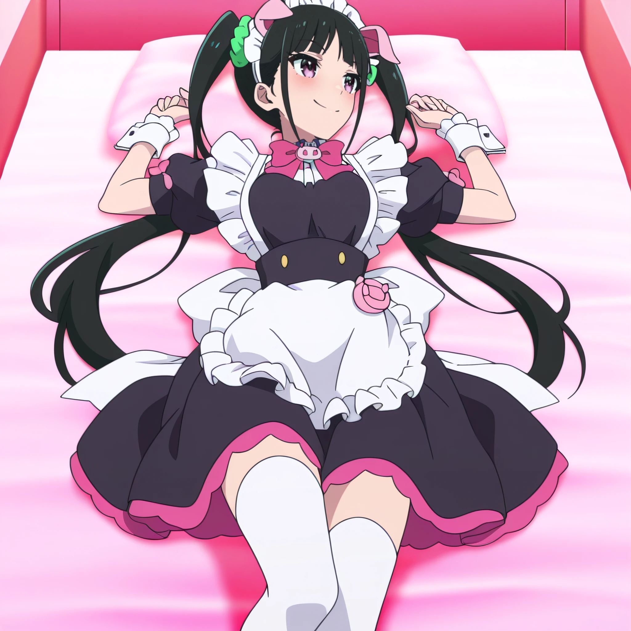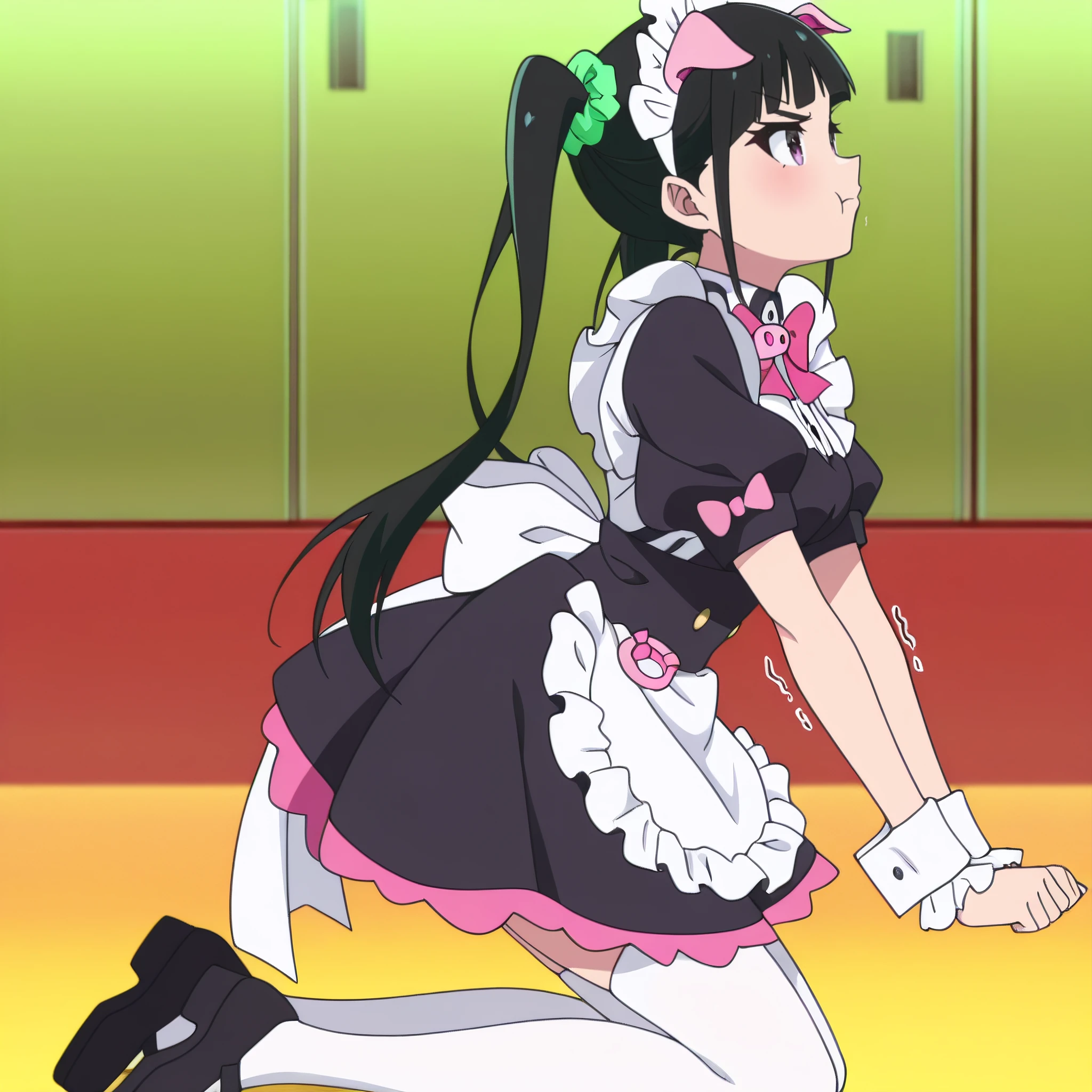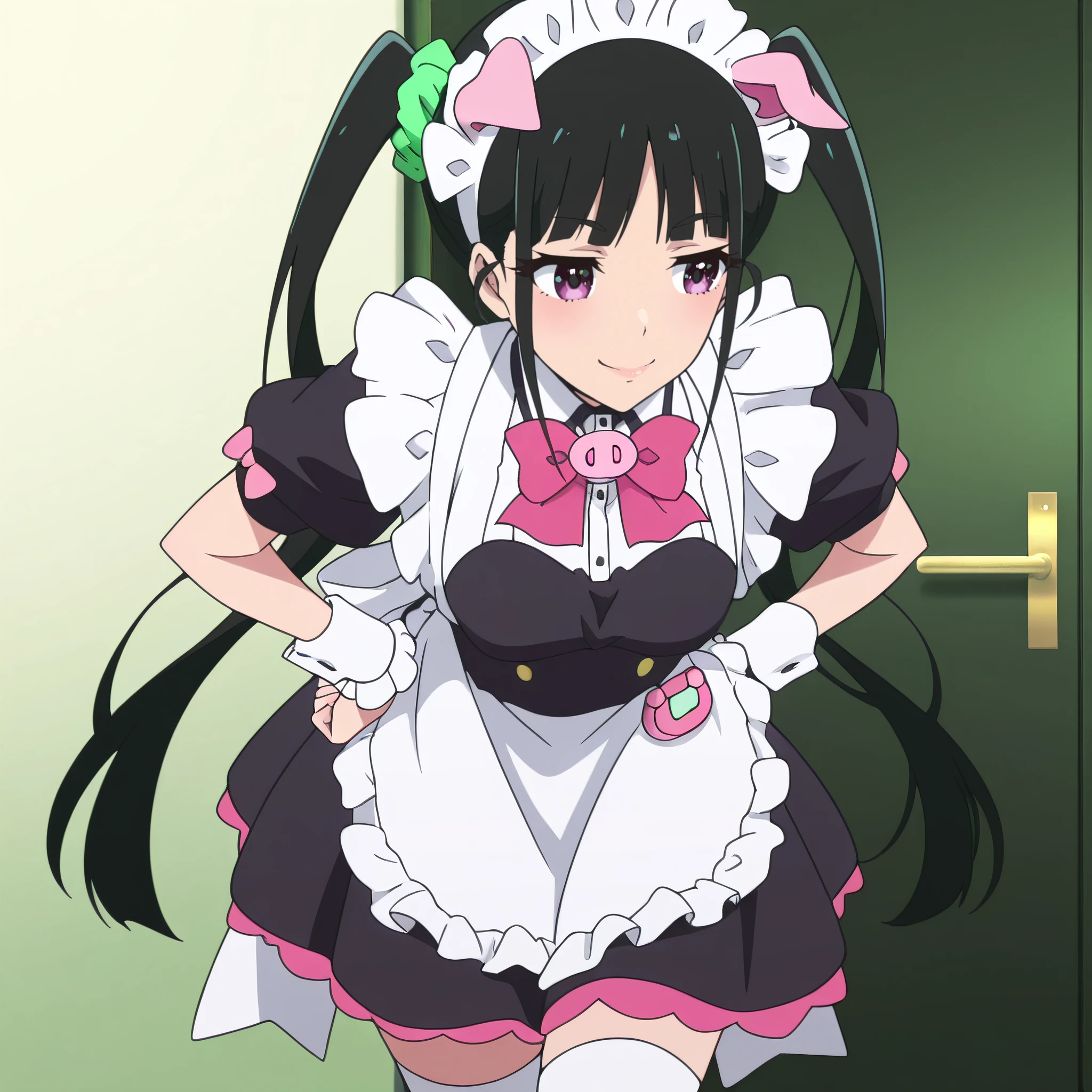 YumechiMaid, maid, maid headdress, apron, maid apron, frills, white apron, pink bow, enmaided, bowtie, wrist cuffs, short sleeves, dress, pink bowtie, hair ornament, hair scrunchie, green scrunchie, pig ears, white thighhighs, black dress, animal ears,